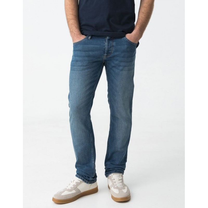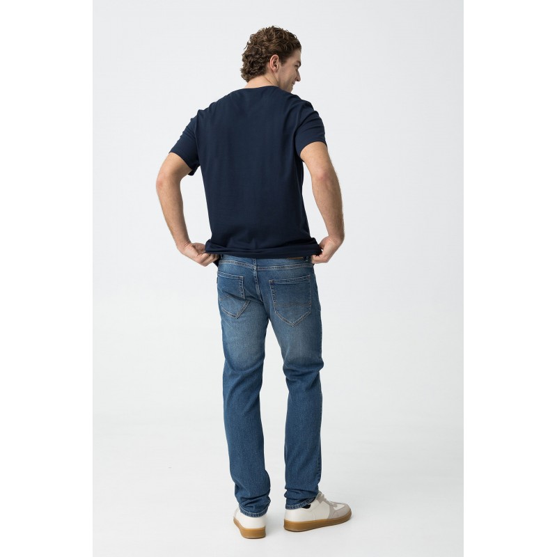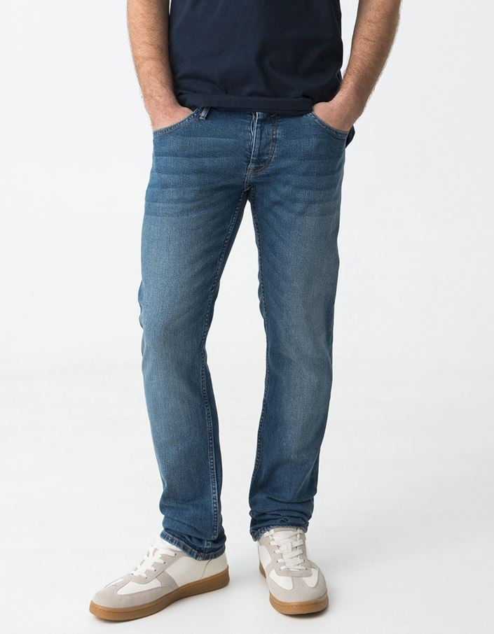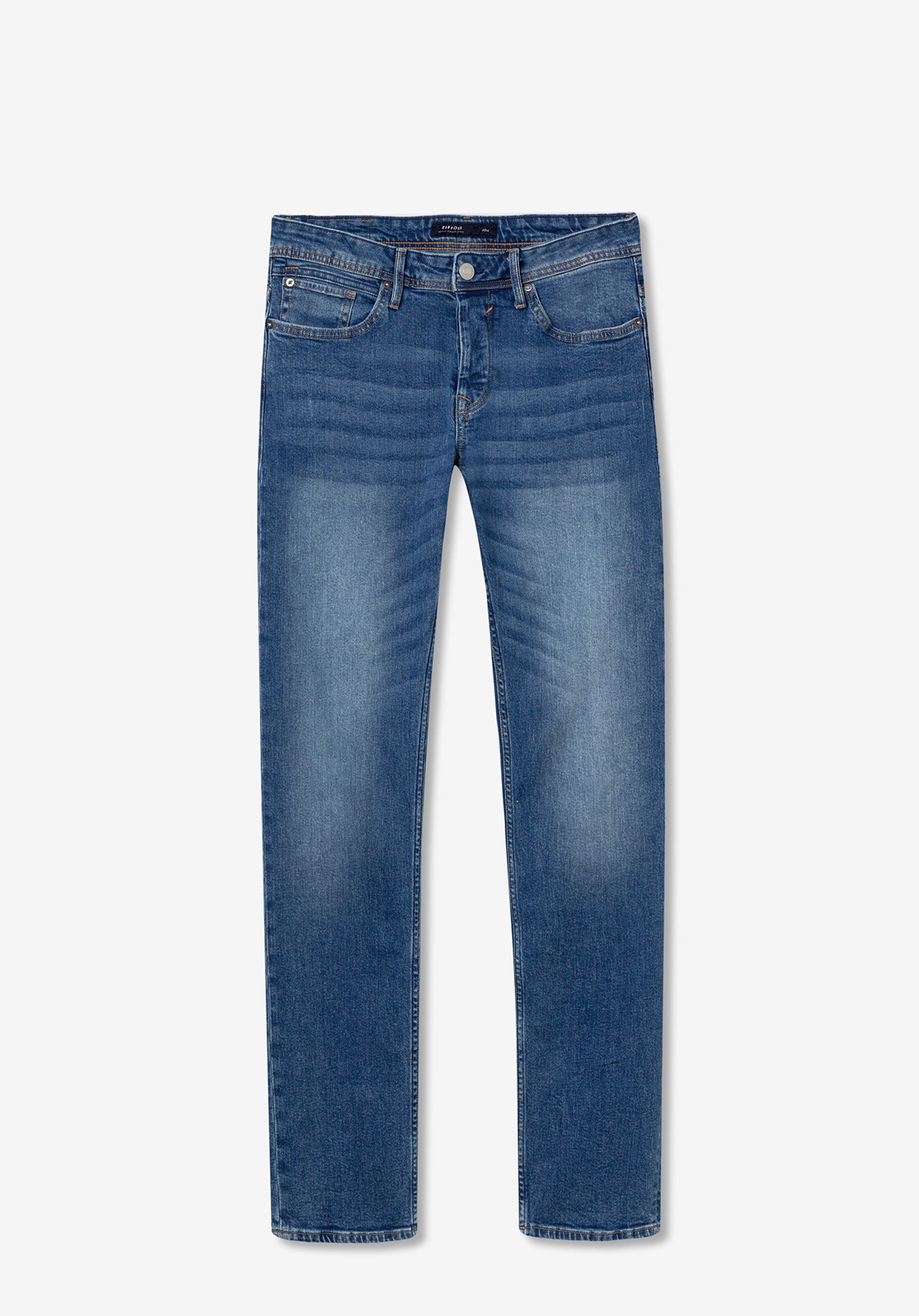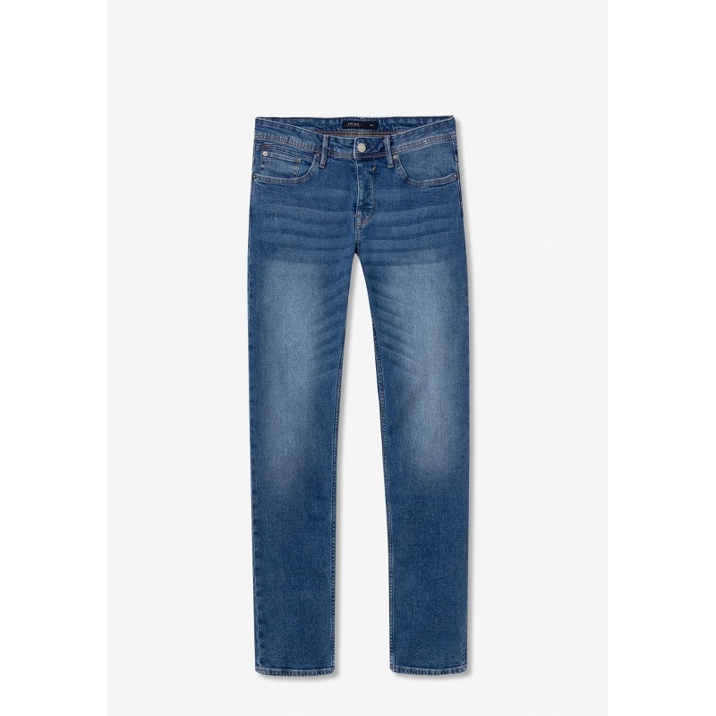 Pantalón denim slim fit para hombre de con cinco bolsillos, cierre frontal con botones ocultos mediante tapeta y botón metálico.