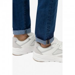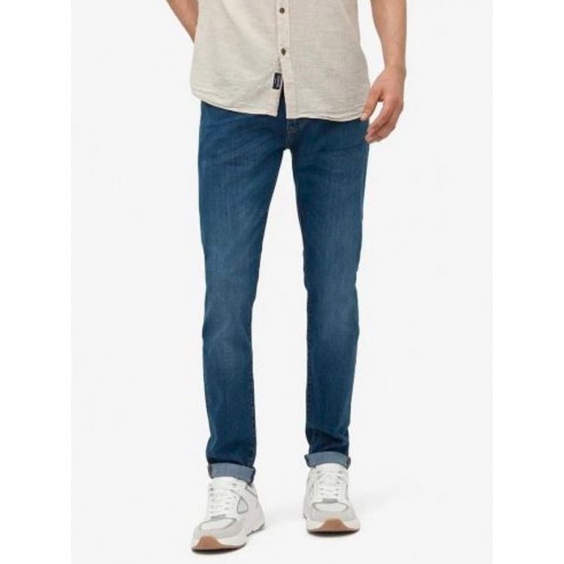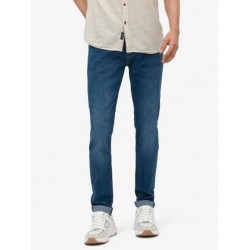 Pantalón jeans slim fit para hombre de cinco bolsillos, cierre frontal con cremallera y botón metálico.