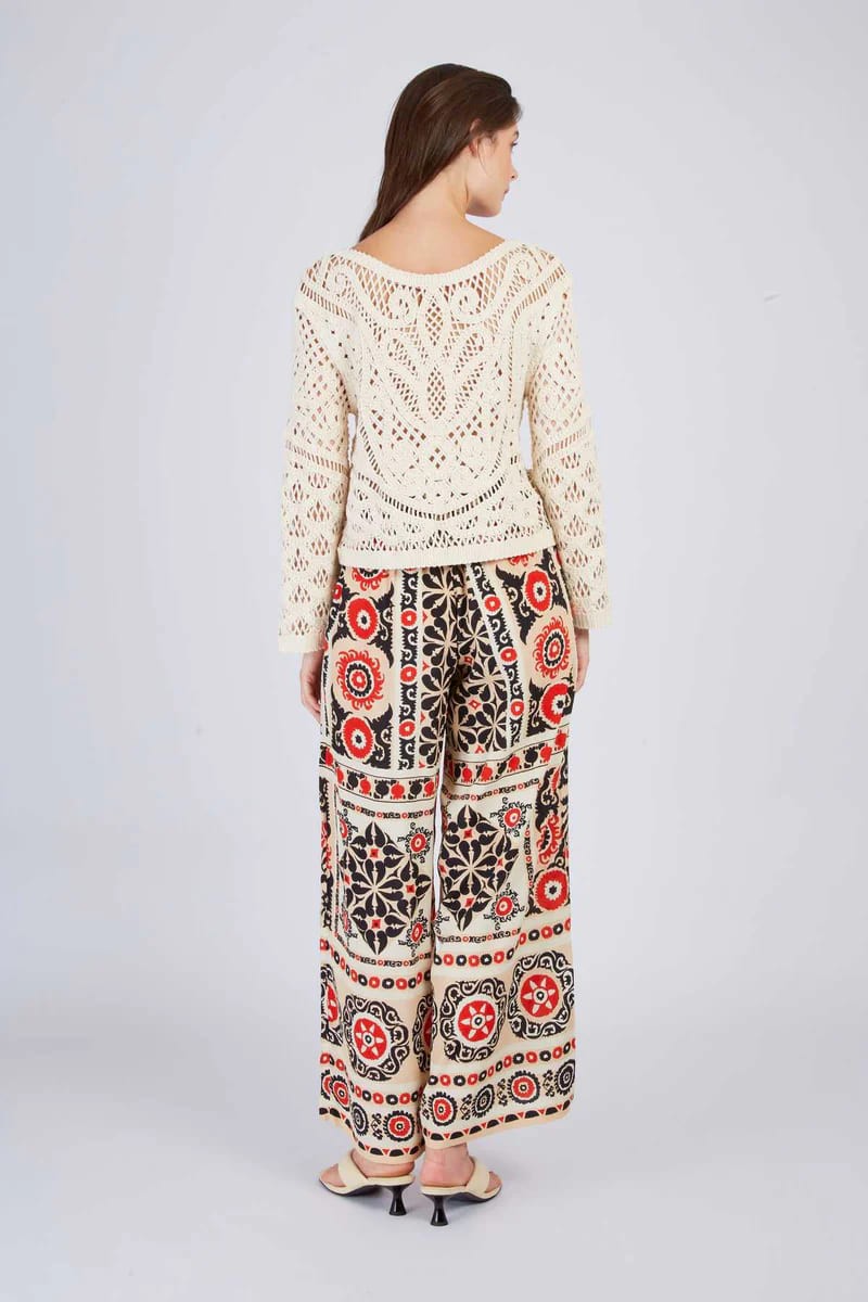 Pantalón para mujer de estampado geométrico de inspiración étnica, cintura alta y elástica, corte suelto y fluido para una comodidad óptima, pierna ancha y largo hasta el tobillo.