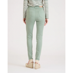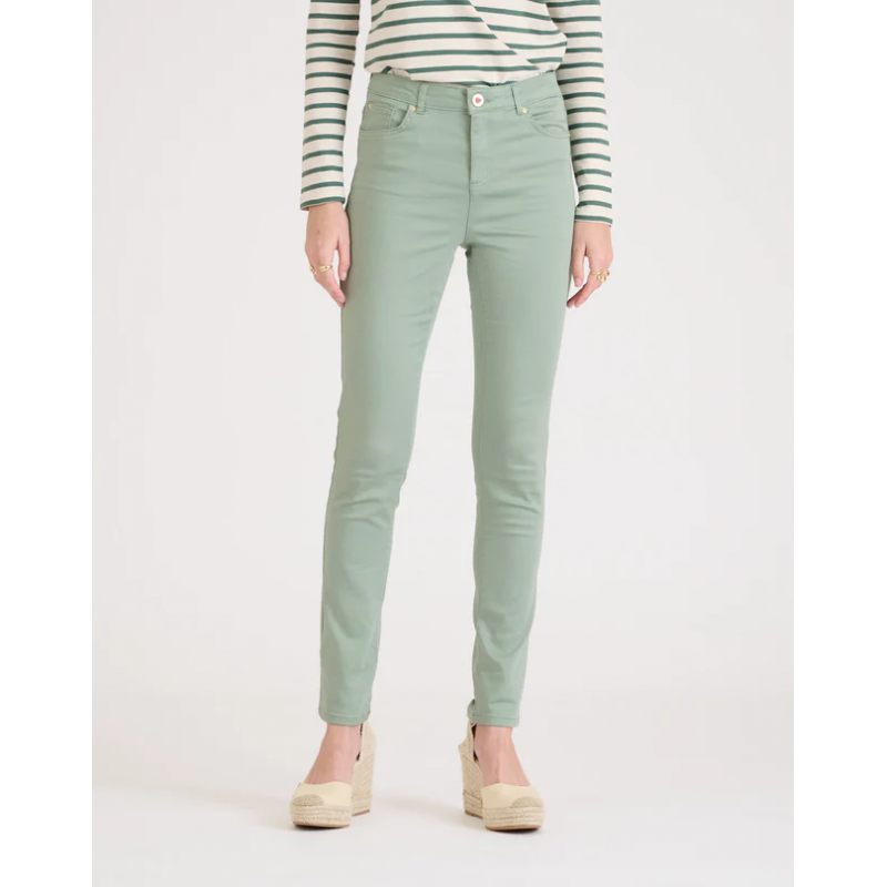Pantalón largo denim para mujer. De cintura alta. Con bolsillos delanteros y traseros. Detalle de botón elegante.