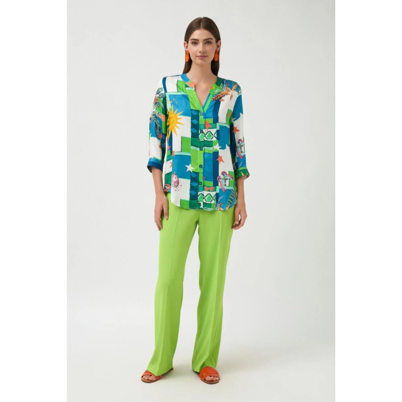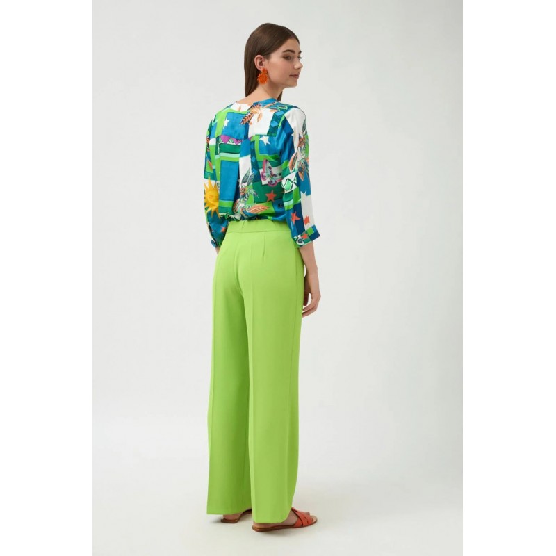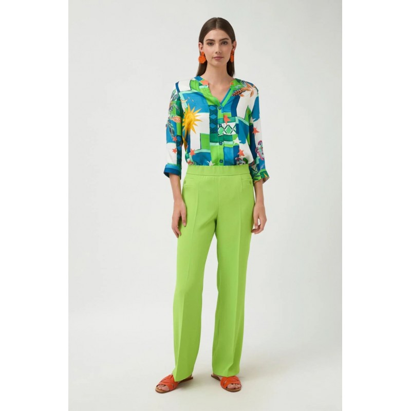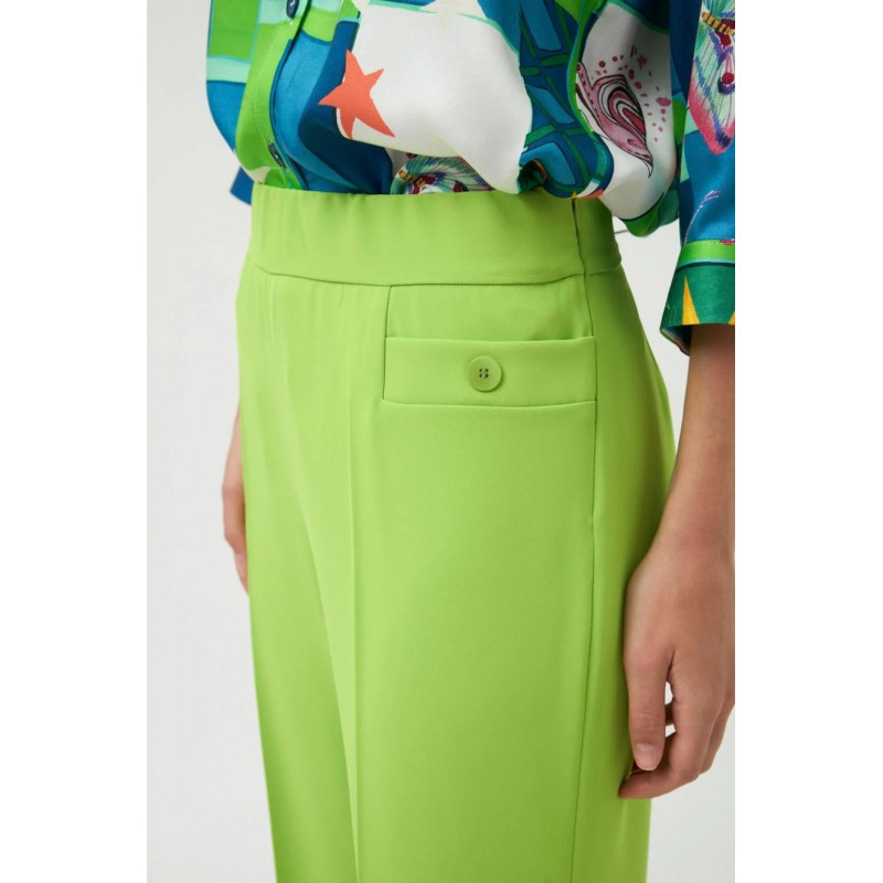 Pantalón largo liso. Diseño recto amplio. Tejido ligero, suave y fluido ligeramente elástico. Bolsillos frontales con cierre de botón. Cintura elástica. Bajo recto.