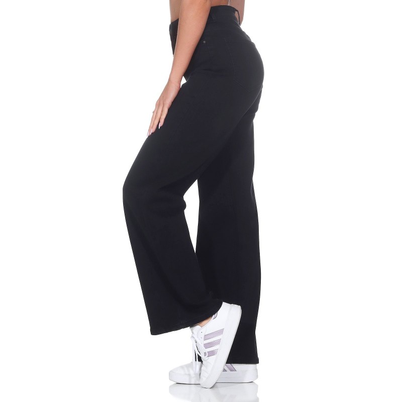 Pantalón denim de mujer de corte ancho, cintura alta y el cierre es con cremallera y botón, dos bolsillos delanteros, un pequeño bolsillo monedero en la parte delantera derecha y dos bolsillos traseros de parche.
