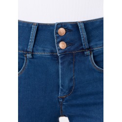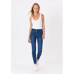 Pantalón denim skinny para mujer. Ajustados de tiro alto con cinco bolsillos. Cierre frontal con cremallera y botones metálicos.
