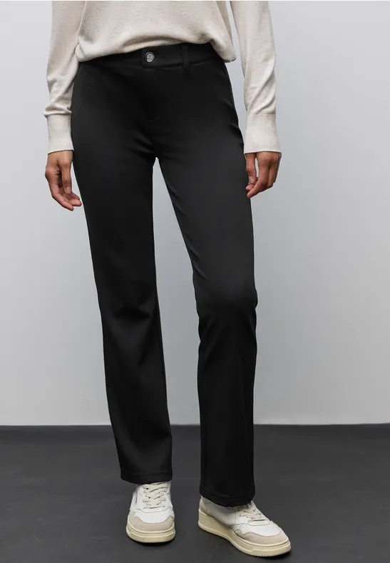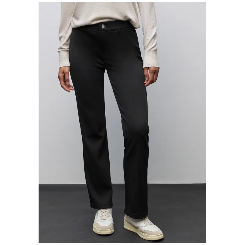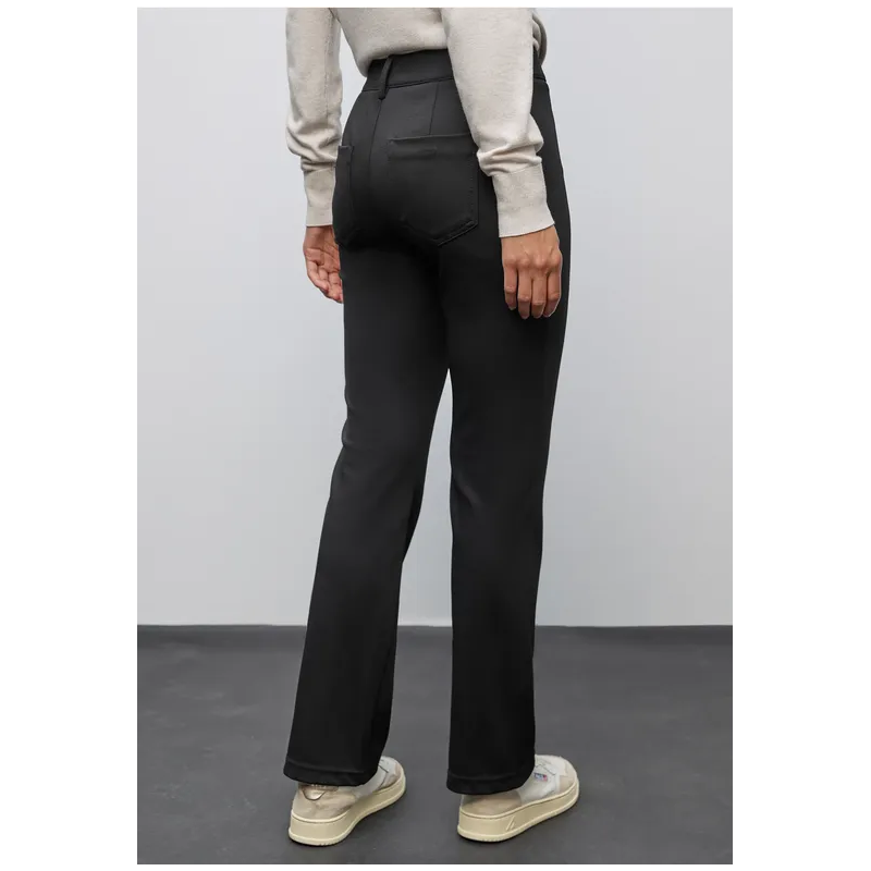 Pantalón de sarga para mujer. Corte ceñido y pernera acampanada. La cintura alta y el color liso crean una silueta moderna, mientras que su elasticidad garantiza una gran comodidad. Una alternativa elegante a los vaqueros clásicos.