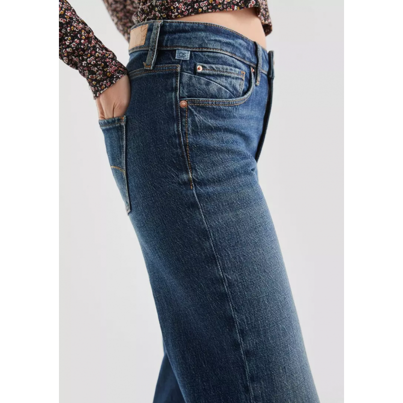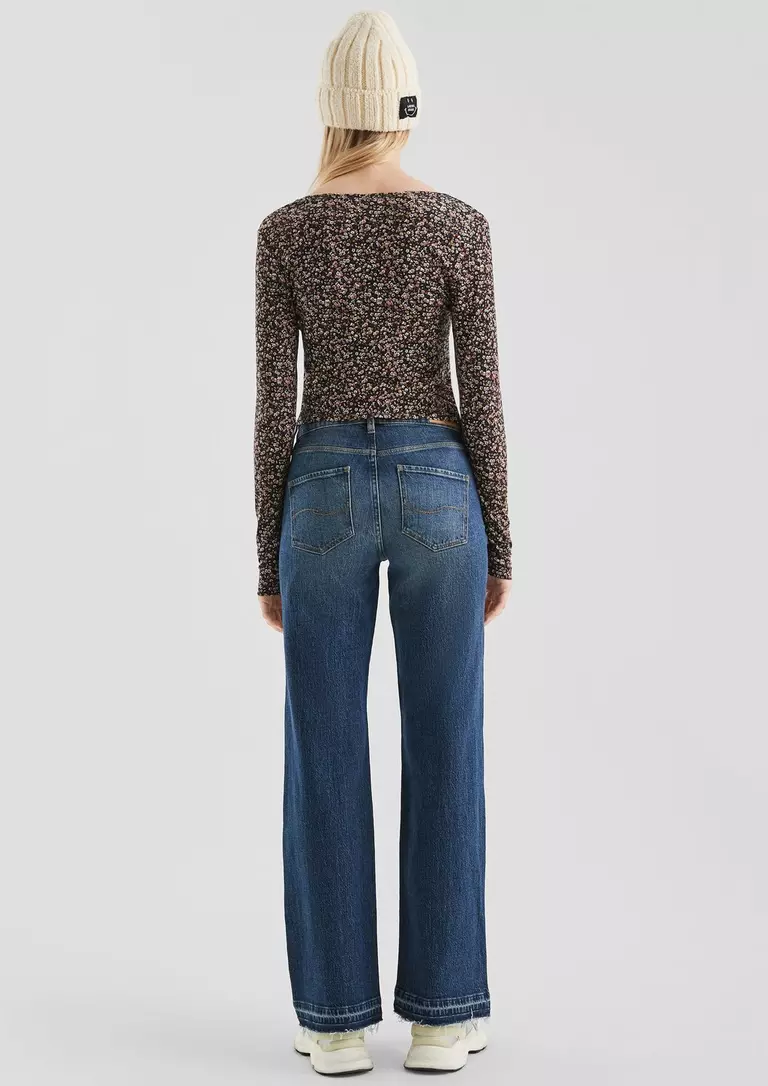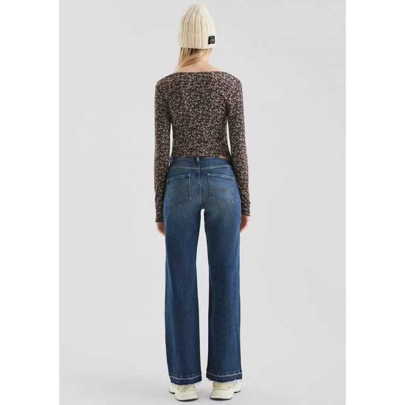 Pantalón para mujer de talle ancho, pierna ancha, diseño efecto desgastado, cierre de botón y cremallera más 5 bolsillos y bajo.