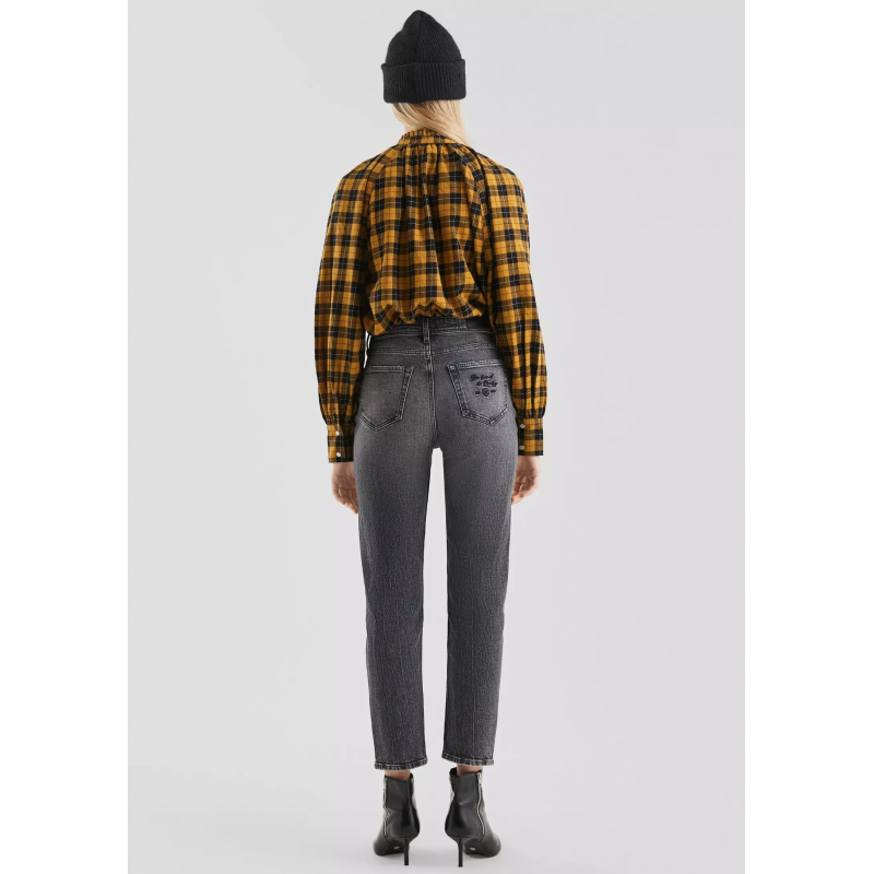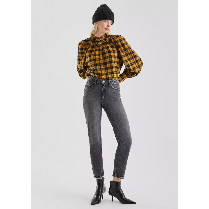 Pantalón para mujer de corte ajustado, tiro alto de cierre de botón y cremallera, 5 bolsillos y tobillero.