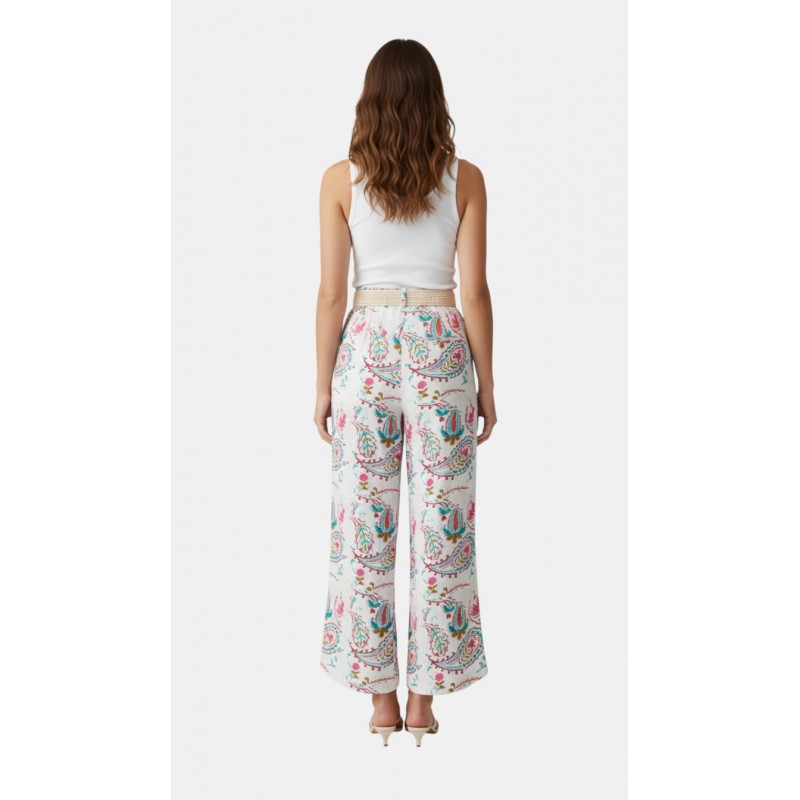 Pantalón Wide Leg estampado para mujer. Motivos de paisley/cachemira multicolor con detalles florales detallados. Incluye un cinturón trenzado tipo rafia con hebilla circular en tono paja natural. Pinzas frontales sutiles para un mejor ajuste en la zona de la cadera y caída impecable.