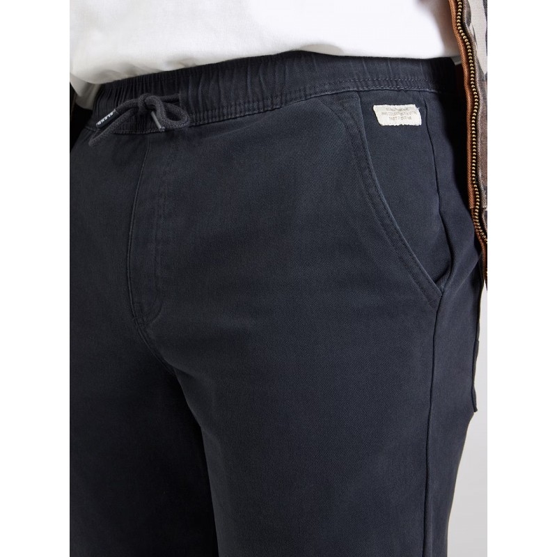 Pantalón regular para hombre de cintura elástica ajustable con cordón, bolsillos laterales y traseros, detalles de la marca y bajo.