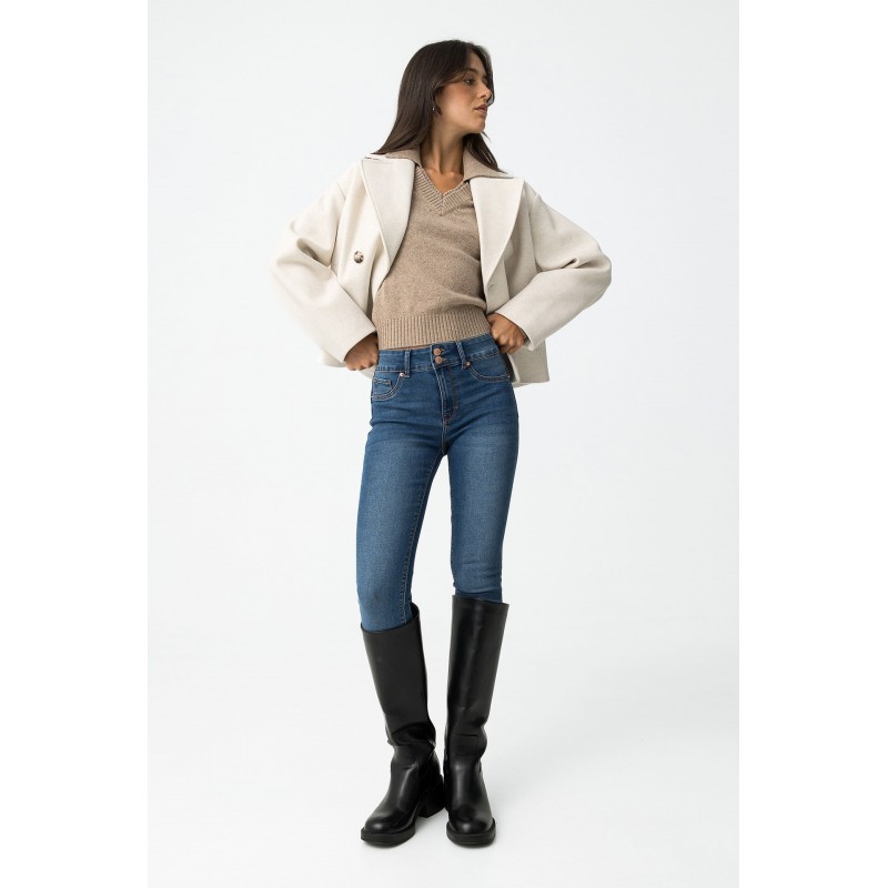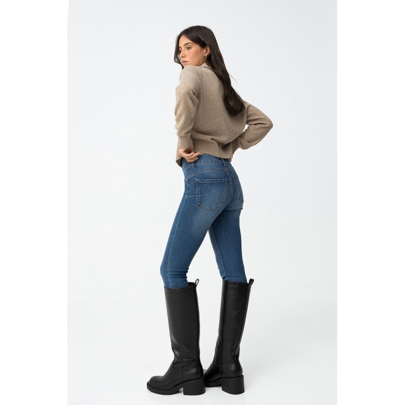 Jeans skinny de cintura media con cinco bolsillos. Apertura frontal con cremallera y botones metálicos. Efecto push-up.