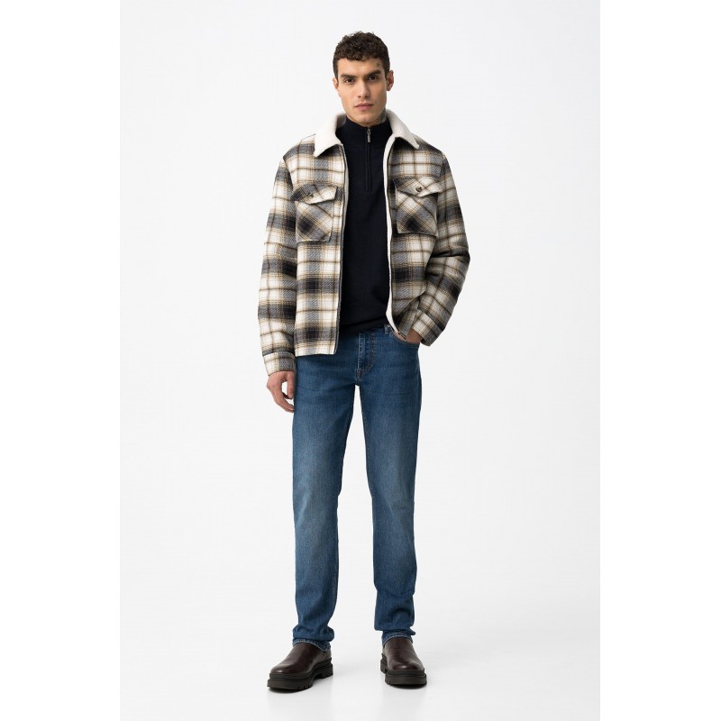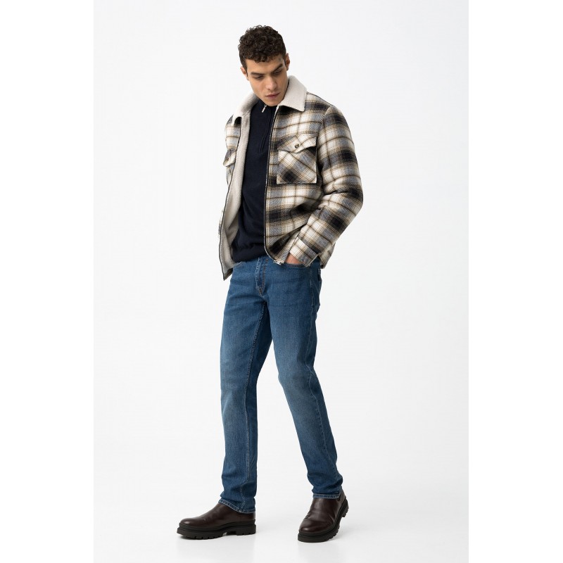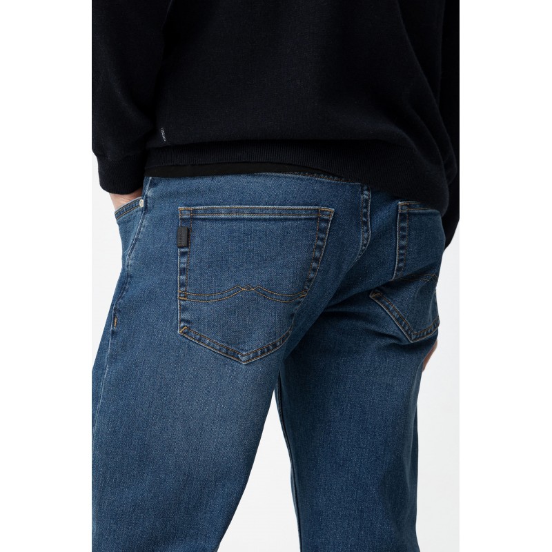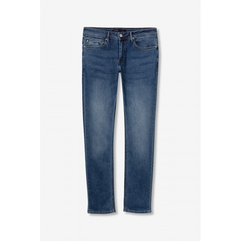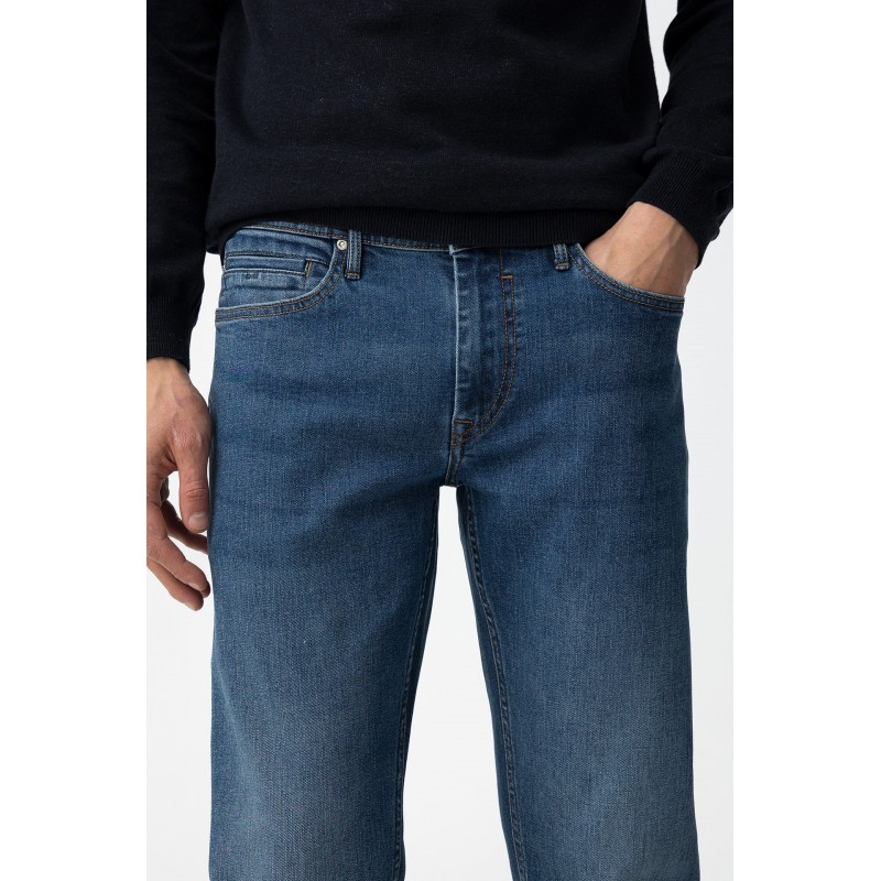 Jeans comfort fit con cinco bolsillos. Cierre frontal con cremallera y botón metálico