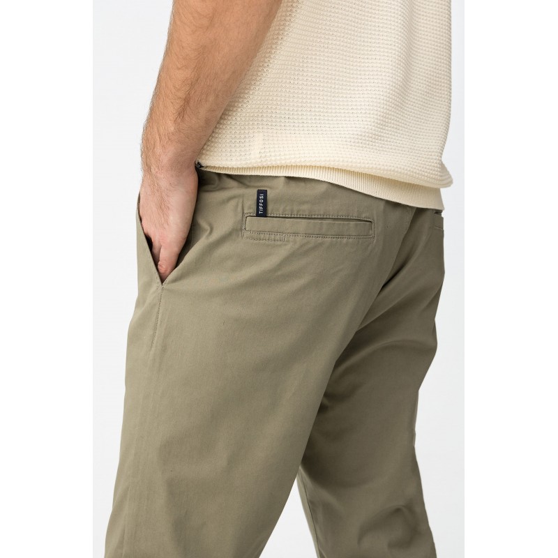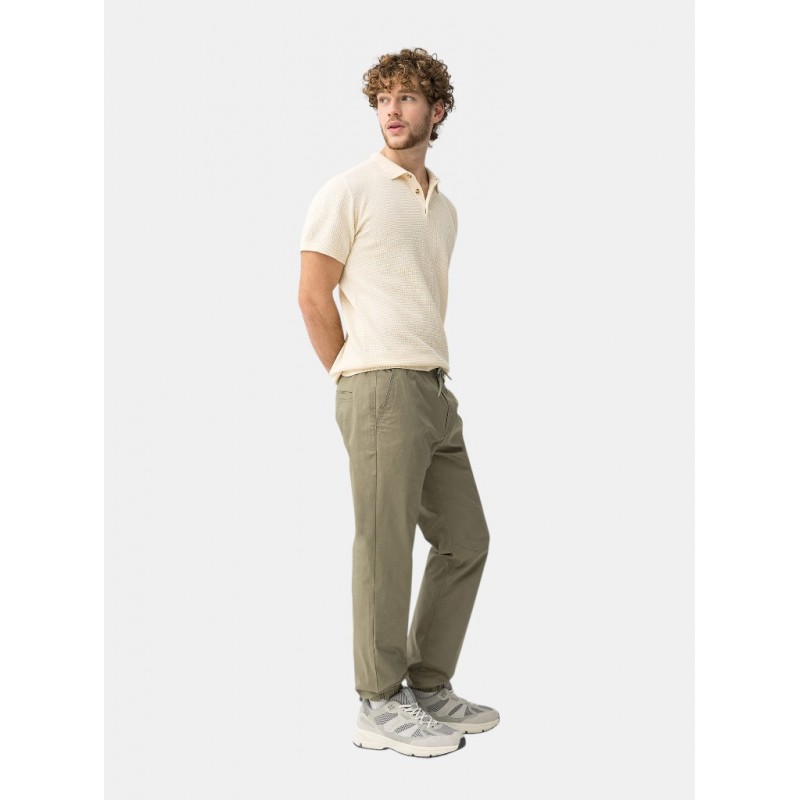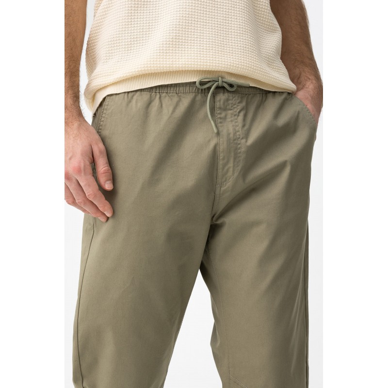 Pantalón slim fit en verde, cintura elástica con cordón y bolsillos laterales, estilo moderno casual.