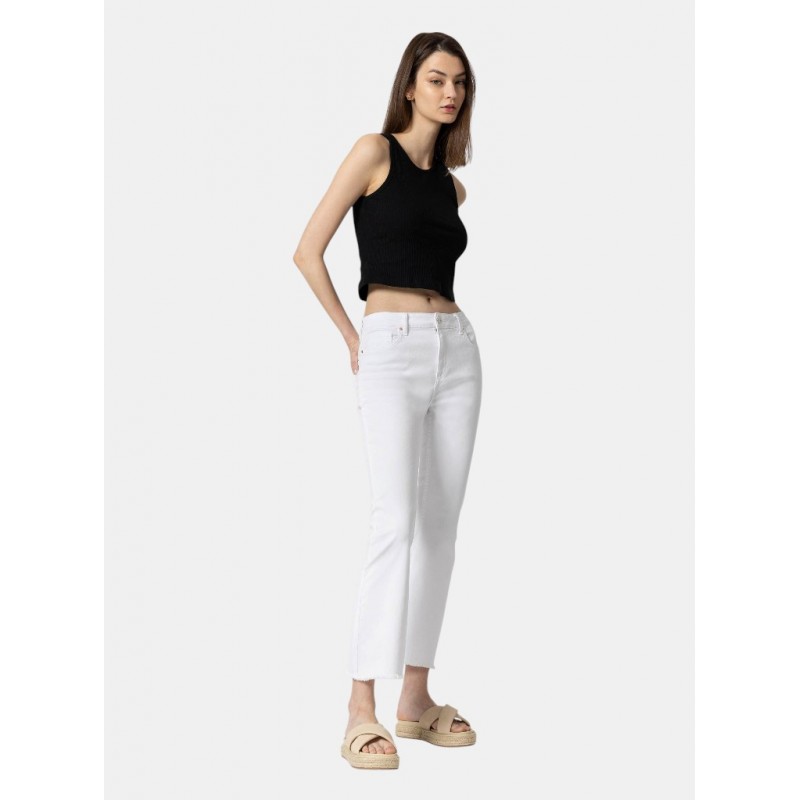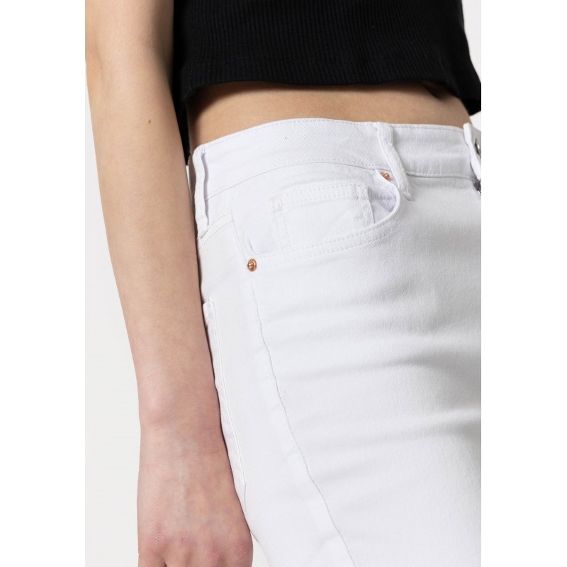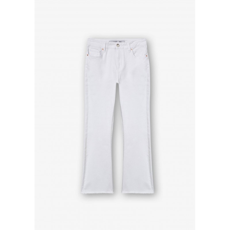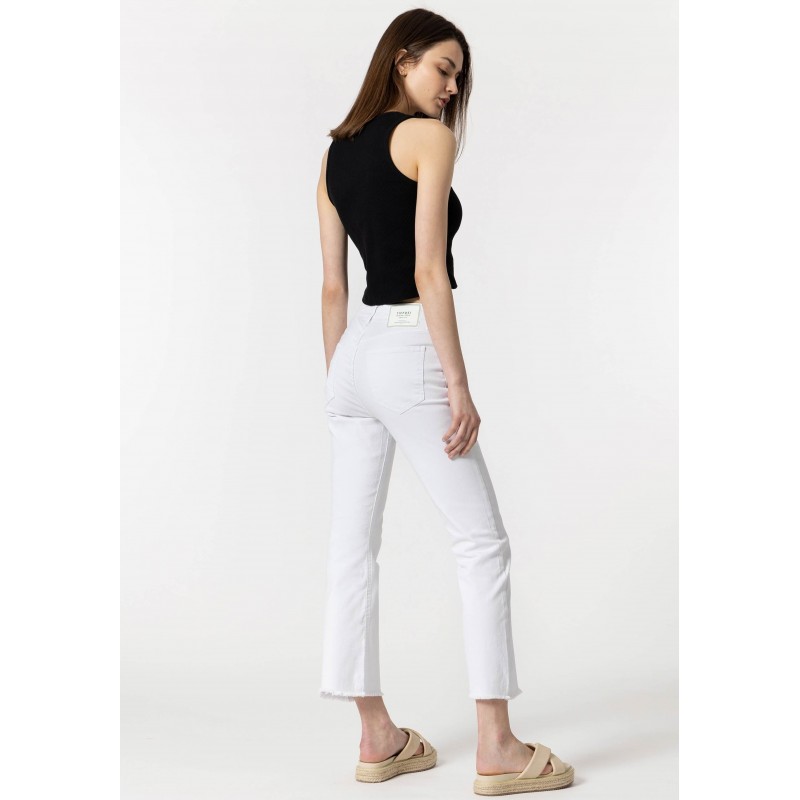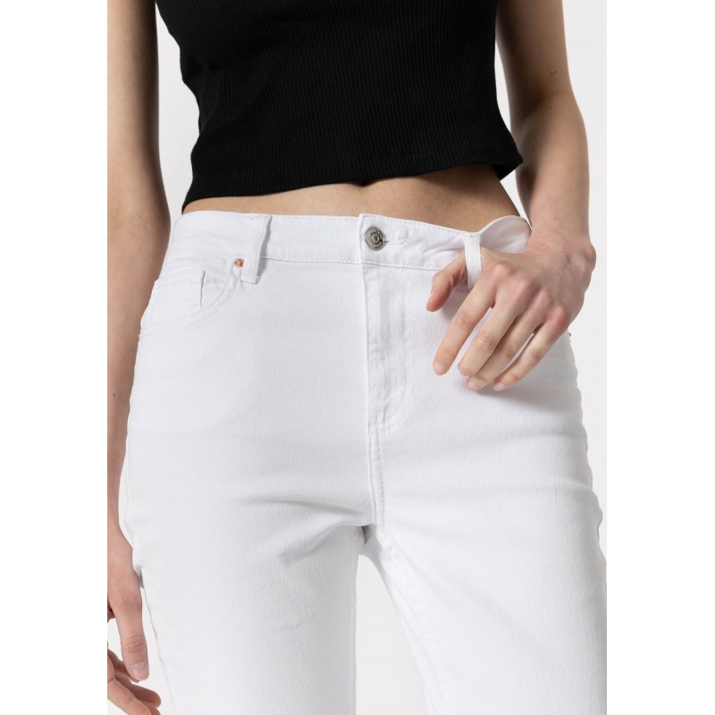 Tejanos de tiro alto con cinco bolsillos. Cierre frontal con cremallera y botón metálico. Bajo desflecado.