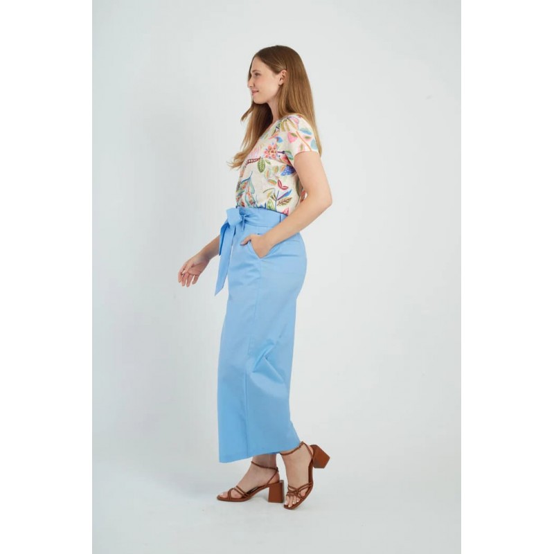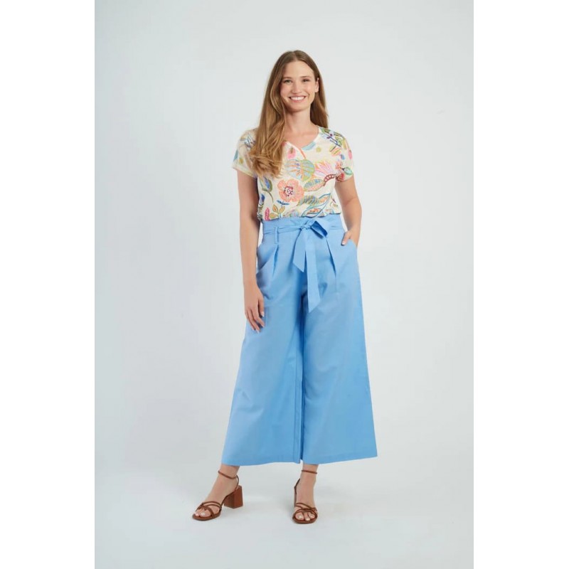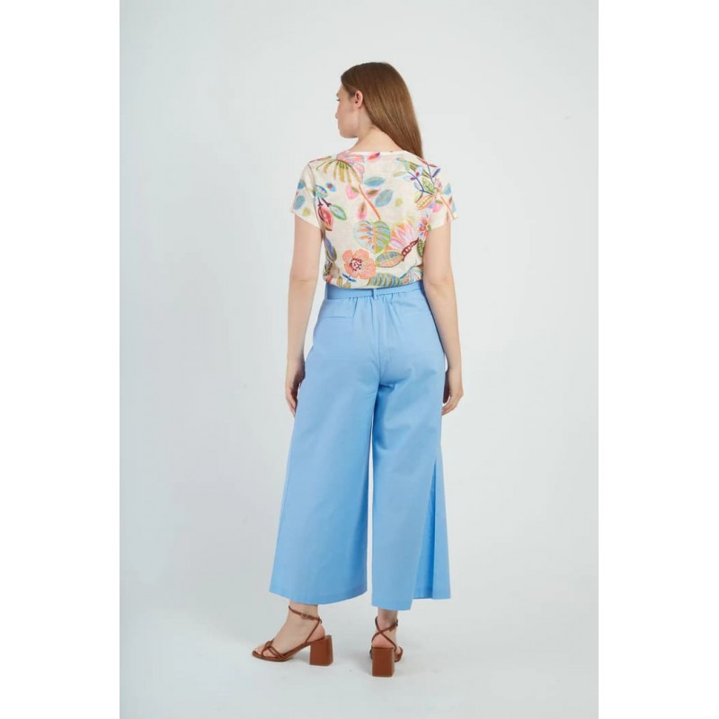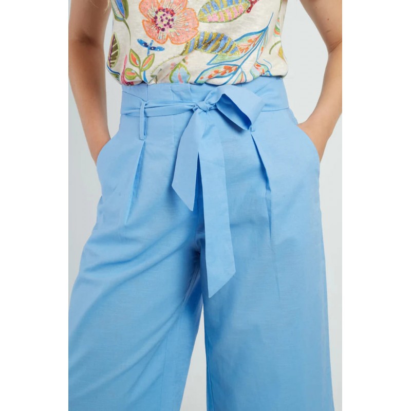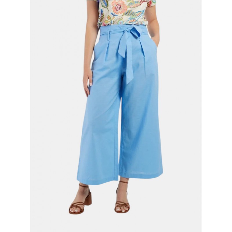 Pantalones anchos y tobilleros de lino ligero, con un corte fluido y cómodo. Cintura ajustable mediante cinturón y bolsillos laterales invisibles para mayor practicidad sin alterar la silueta. Ideales para un look veraniego relajado pero elegante.
