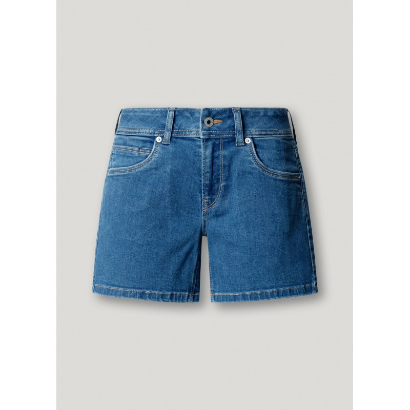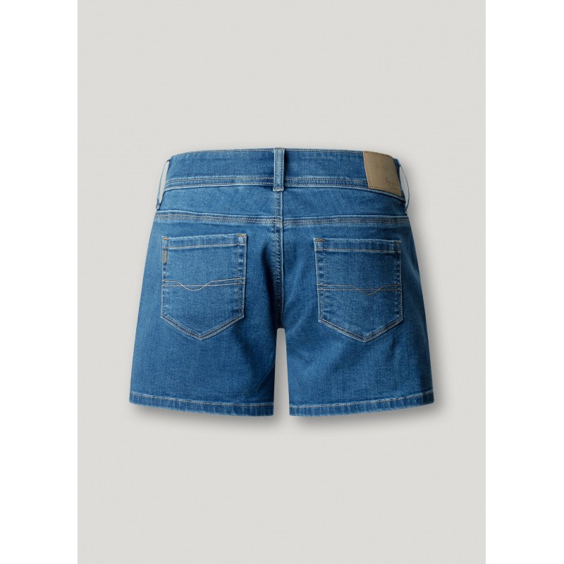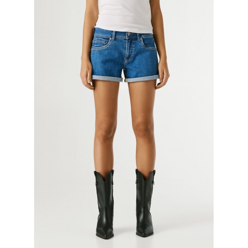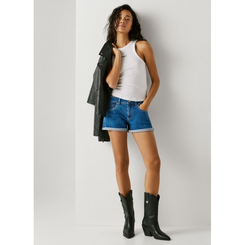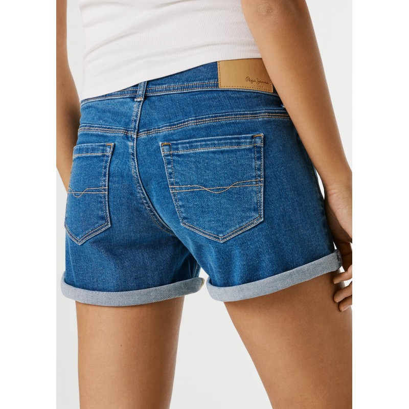 Pantalón denim regular fit para mujer de tiro bajo, cierre de cremallera y borón con 5 bolsillos, detalles de la marca y corto.