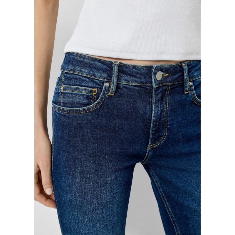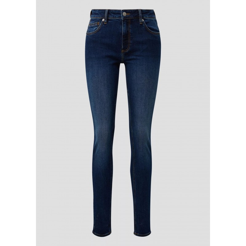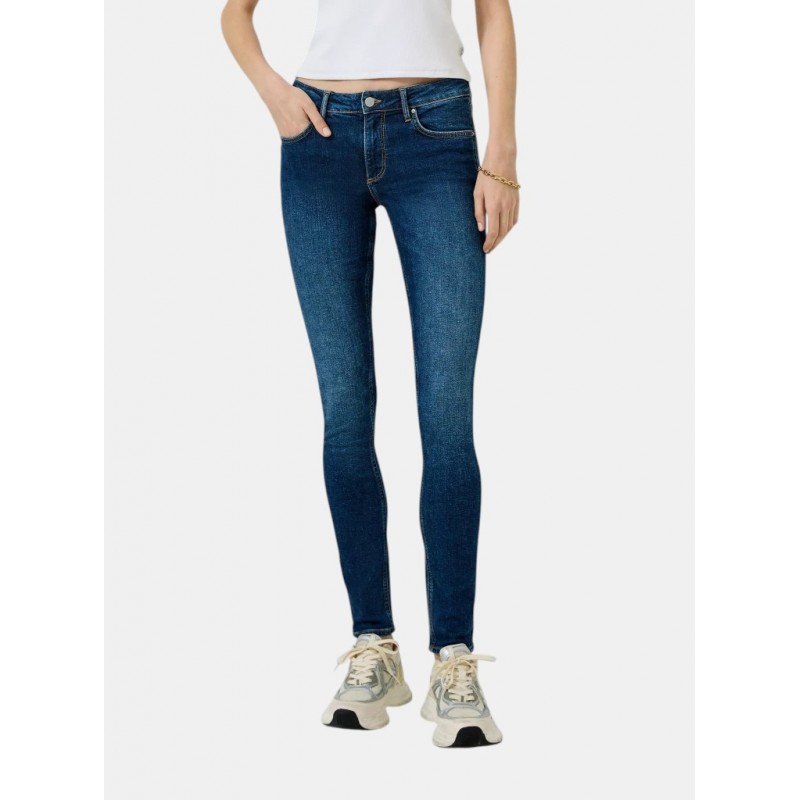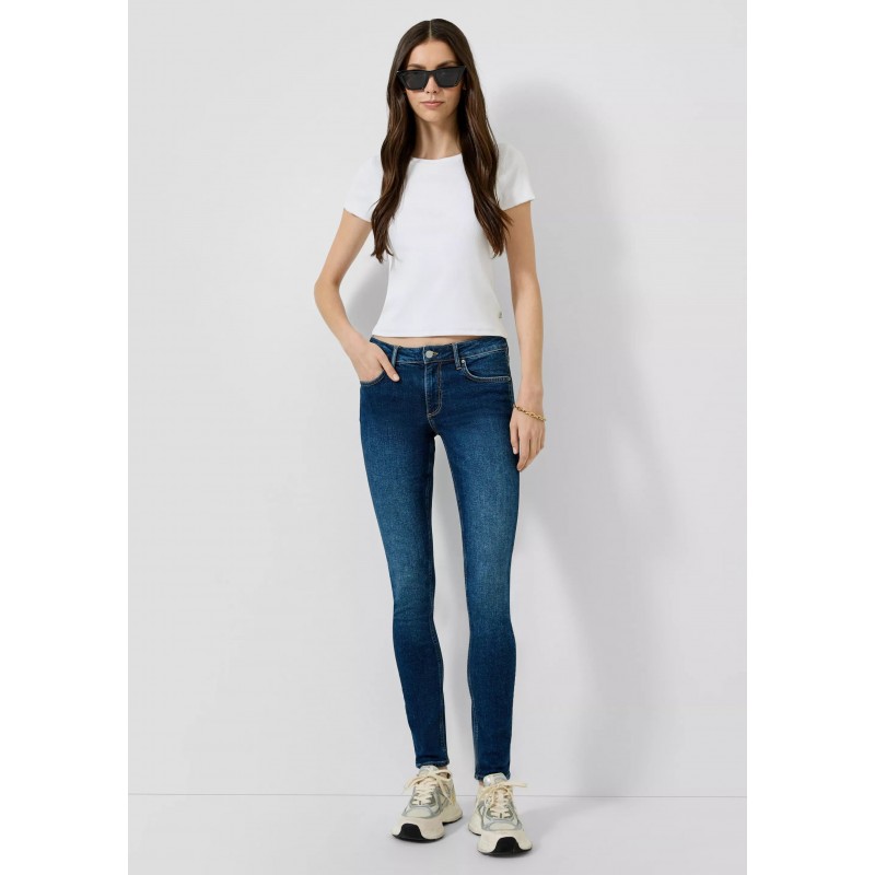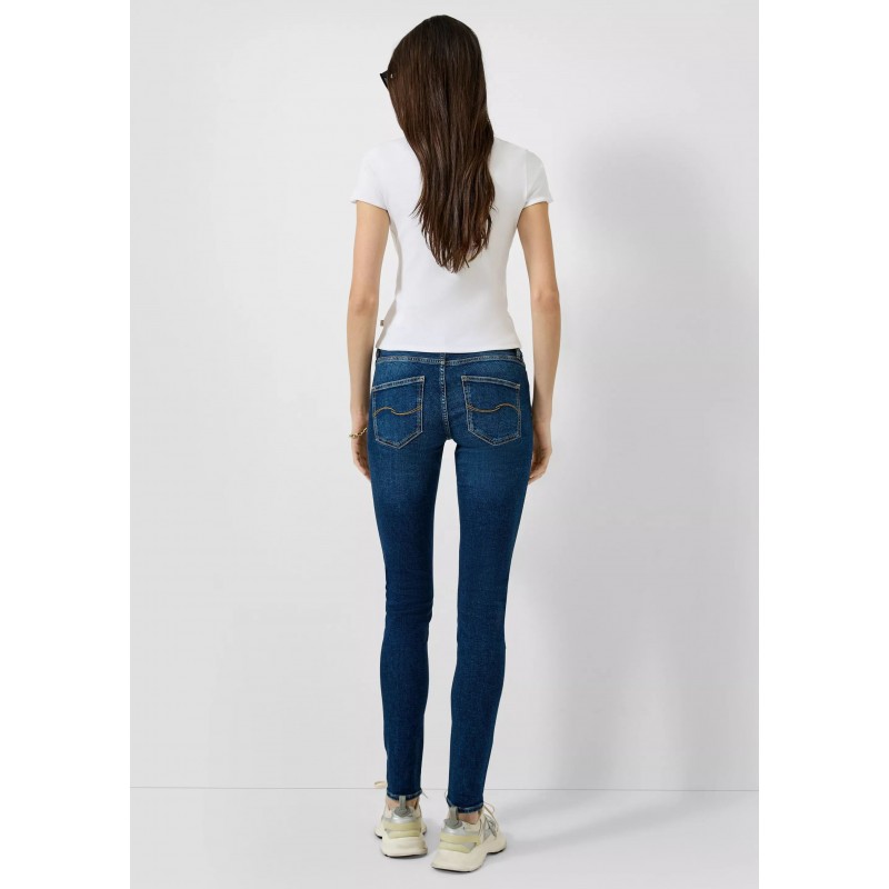 Pantalón denim para mujer de tiro medio, pierna ajustada, cierre de botón más cremallera, 5 bolsillos y largo.