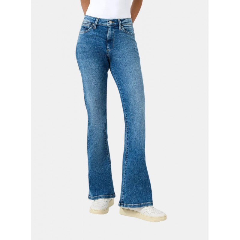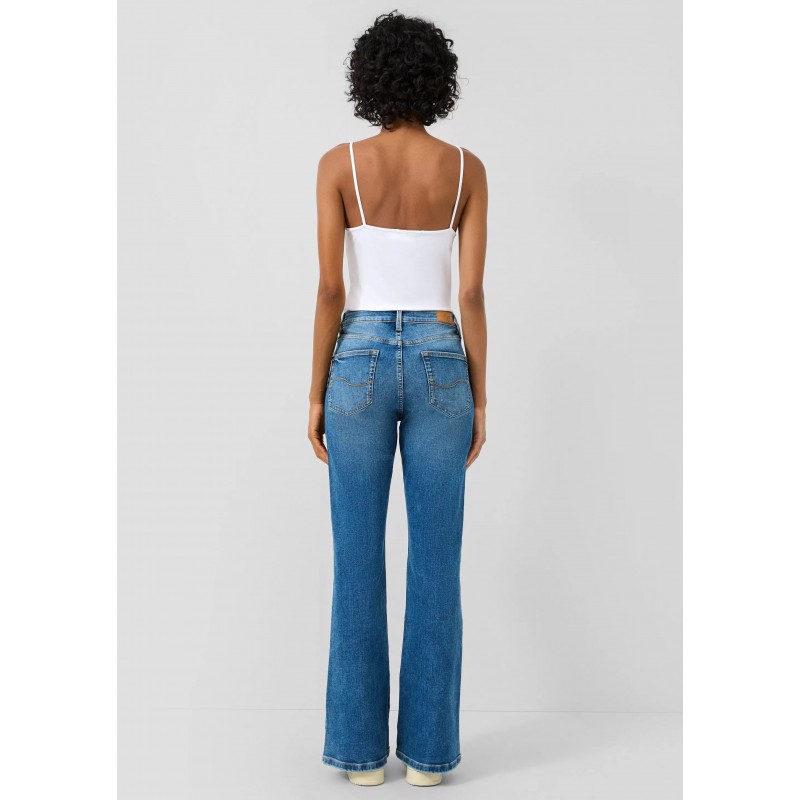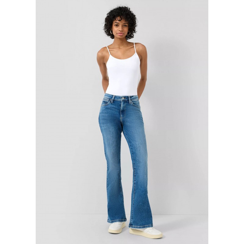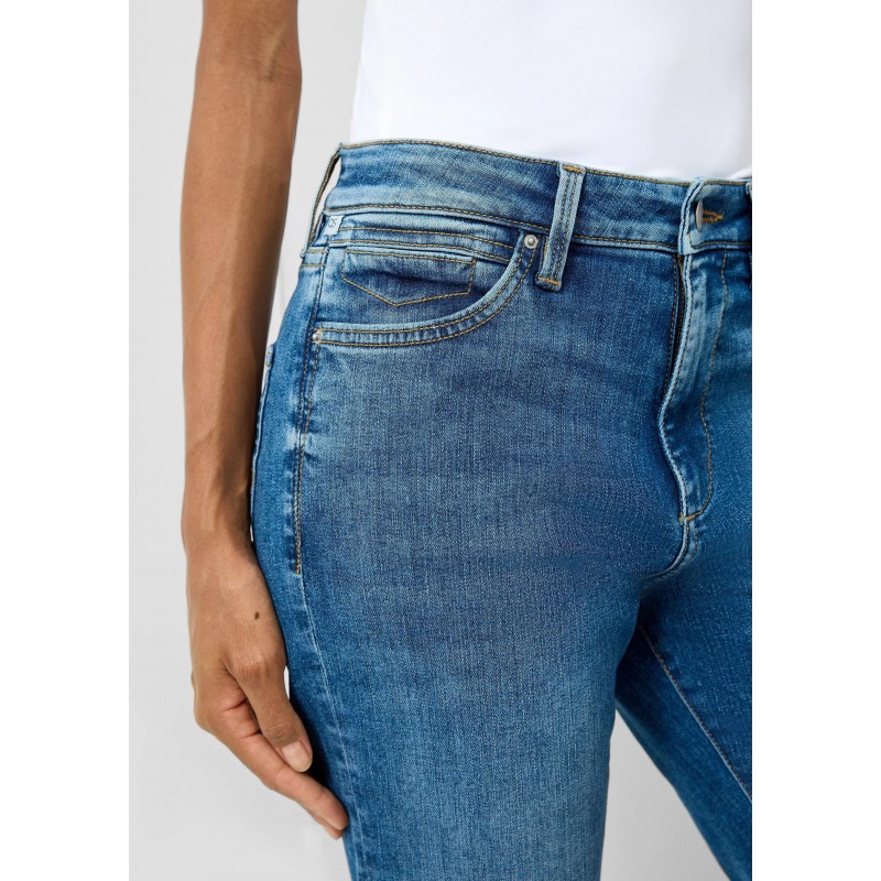 Pantalón denim para mujer de corte ajustado y una moderna pernera acampañada, cierre de botón más cremallera, cinco bolsillos y largo.