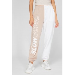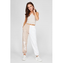 Pantalón tipo jogger de dos colores. Tiene fruncido en la cintura y en los bajos. Dos bolsillos laterales.