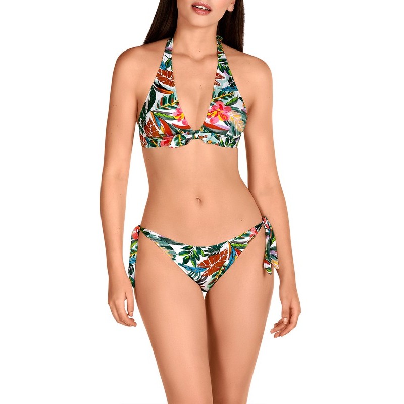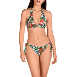 Bikini en forma de triángulo para mujer. Lleva una pieza justo en el centro del pecho que le da un toque diferente y original. Los tirantes son multiposición por lo que podrás llevarlo atado al cuello o al hombro. La braguita es de tiro bajo con una cobertura media, lleva tiras laterales para ajustar a la medida. El estampado tropical en tonos verdes es muy favorecedor.