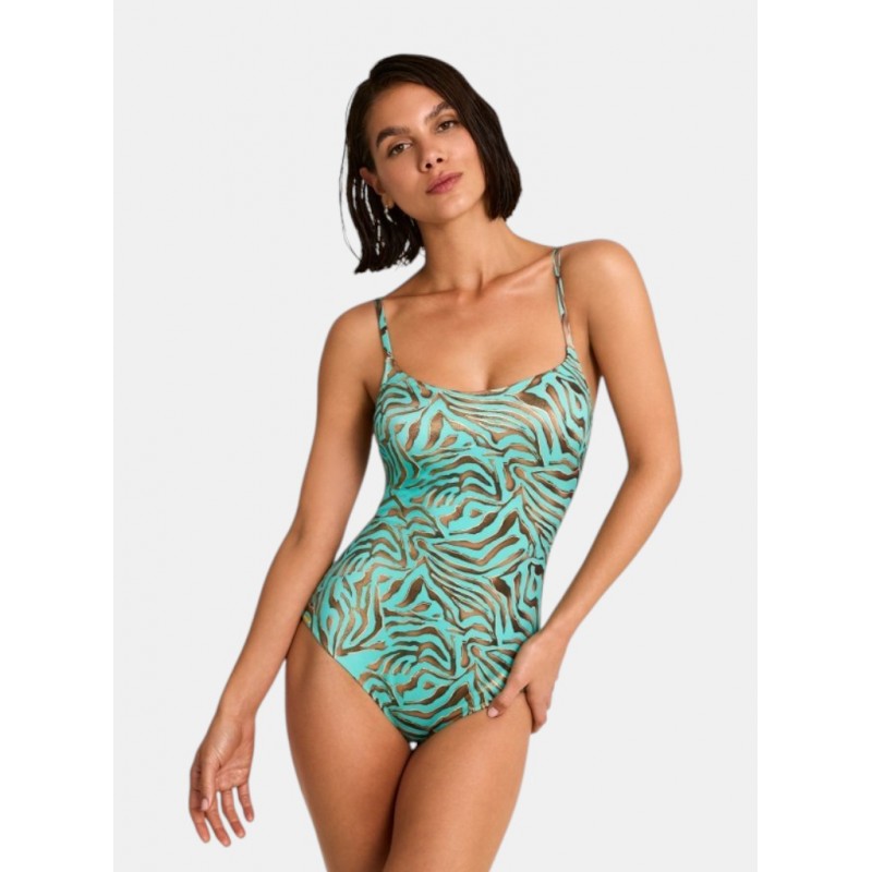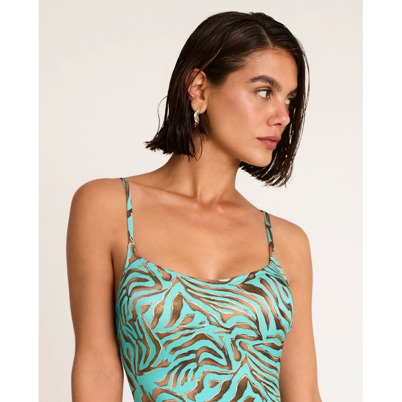 Bañador de mujer de escote cuadrado. Con copa interior, sin aro y tirantes cruzados. Con un estampado animal print de trazo orgánico que transmite instinto, fuerza y libertad, celebrando una feminidad segura y poderosa. Pertenece a la colección Utopía donde lo imposible se transforma en realidad.