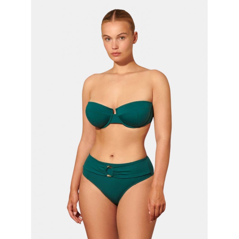 Bikini reductor de aros interiores de Copa D que combina sujeción y comodidad con un diseño actual y favorecedor. Su estructura balconette sin foam incluye costuras y refuerzos que se adaptan perfectamente al busto, tirantes extraíbles que permiten personalizar el ajuste del top. Parte baja estilo retro con drapeado delantero y detalle circular decorativo altura lateral de la braga: 13 cm.