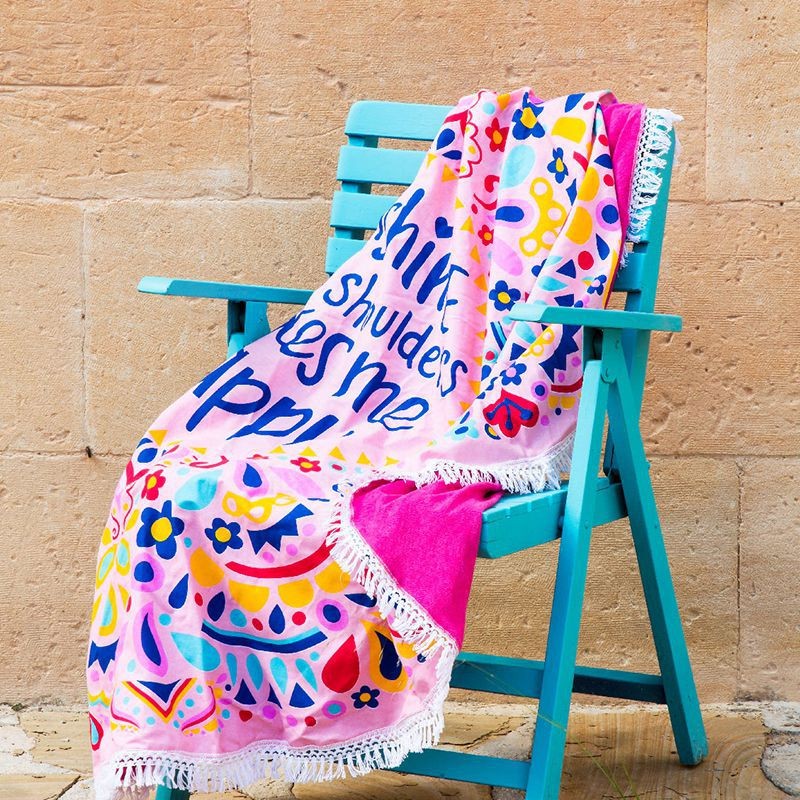 La toalla pareo tiene un divertido estampado multicolor con un mensaje central para los enamorados del sol.