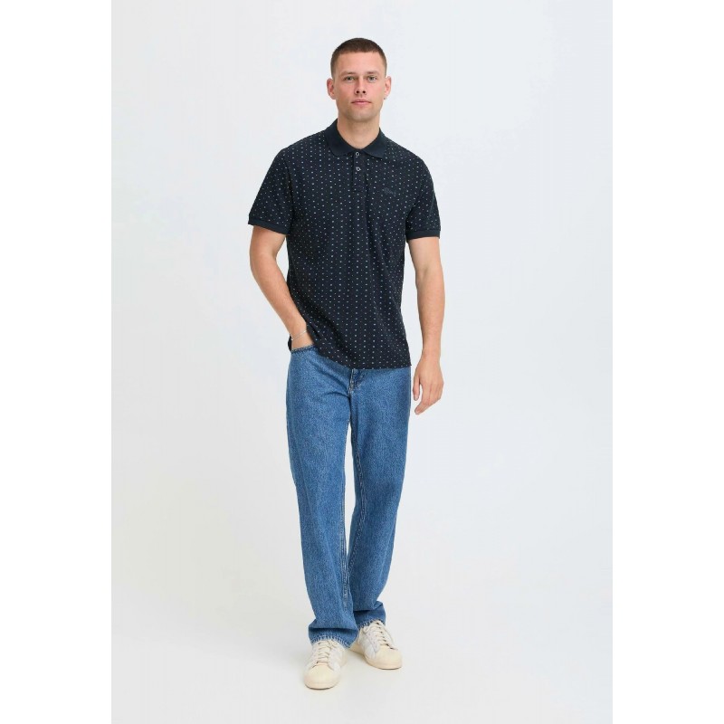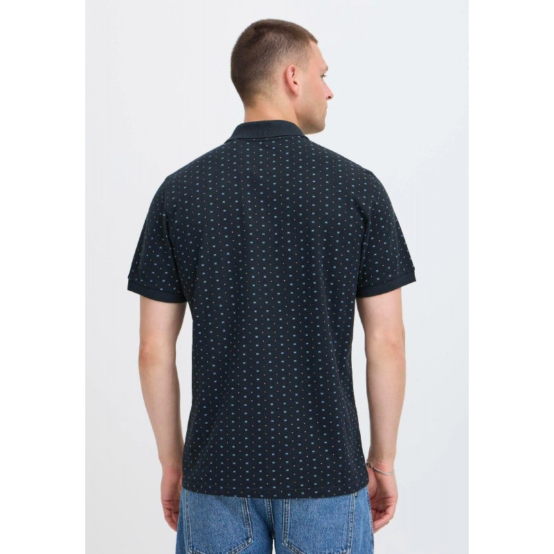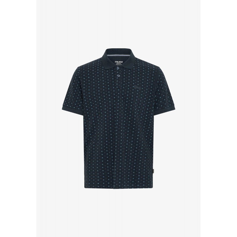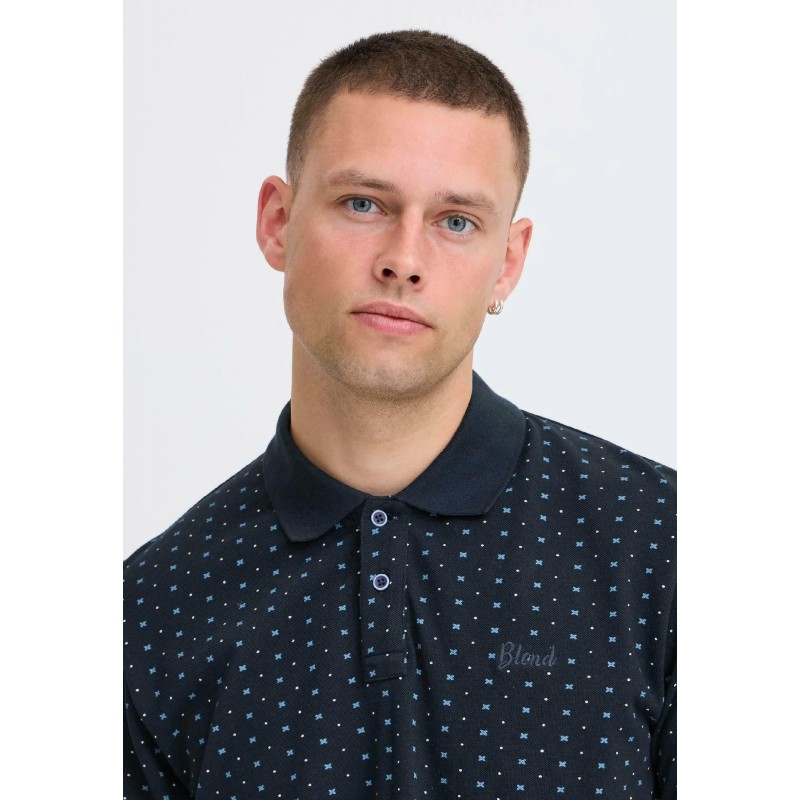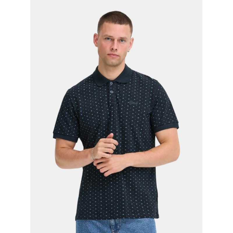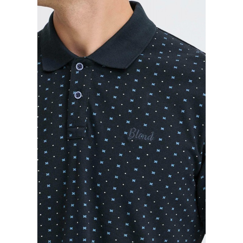 Polo piqué en color marino con estampado integral, cuello y borde manga en colores lisos, además presenta logo bordado en mismo tono