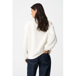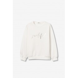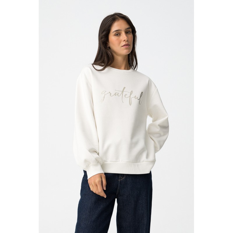 Sudadera estampada para mujer. Con mensaje metálico frontal, corte relajado y mangas largas. Interior suave y cálido.
