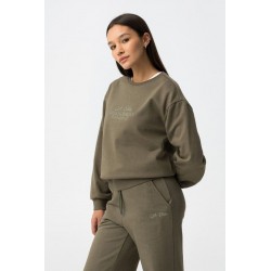 Sudadera basica para mujer. De corte regular está confeccionada en un tejido de punto suave y agradable al tacto. Con mangas largas y cuello redondo, está rematada con ribetes acanalados en cuello, puños y bajo para un look limpio y estructurado. Un bordado en relieve en la parte delantera le aporta un sutil toque de textura y estilo.