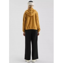 Sudadera para mujer de capucha con cordones ajustables, cierre de cremallera, bolsillos laterales, diseño en el pecho bordado y cintura y mangas largas elásticas y fruncidas.