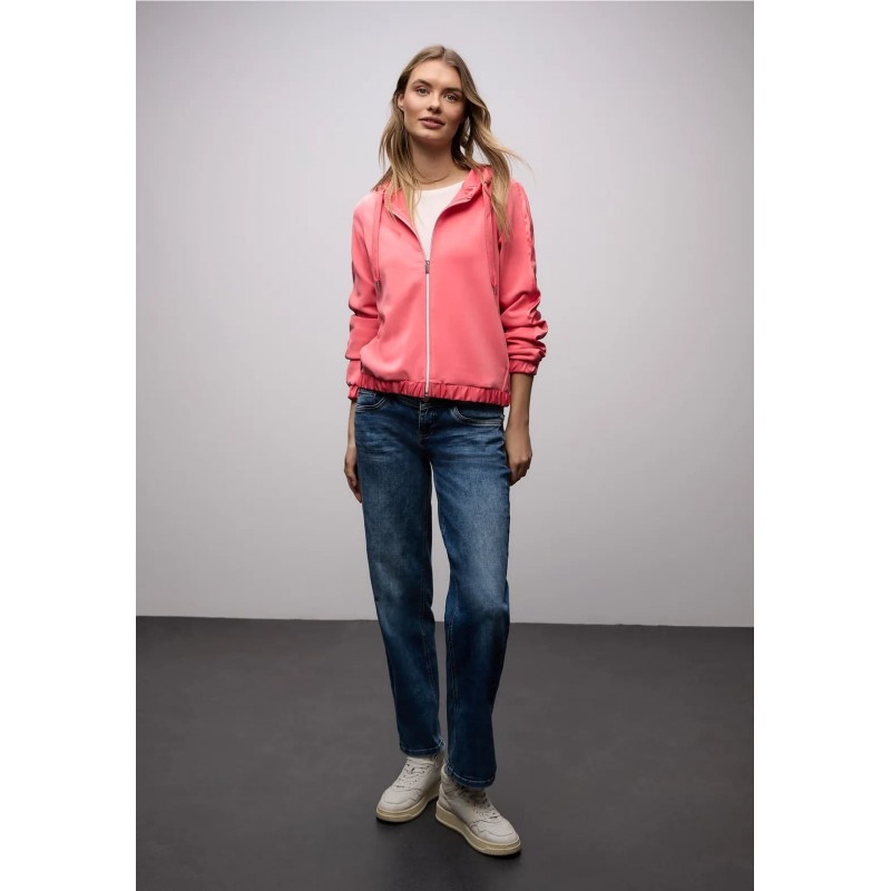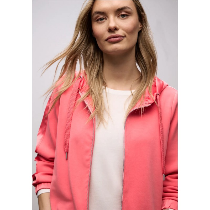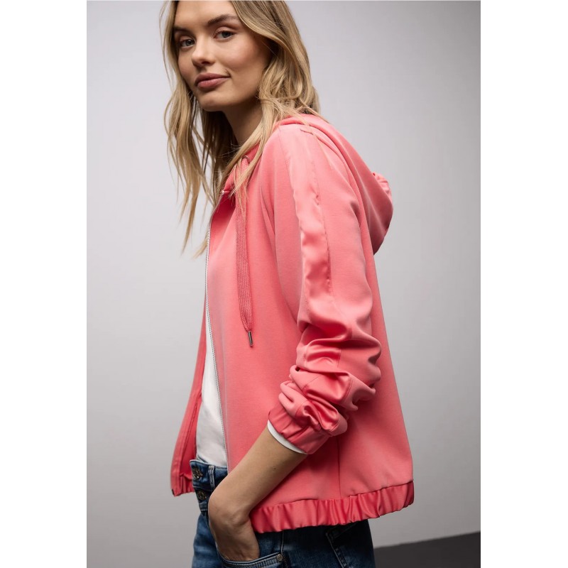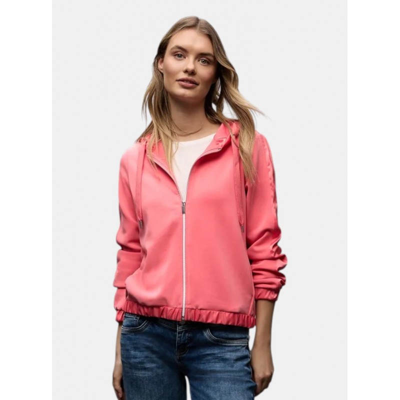 Sudadera para mujer de capucha ajustable con cordón, cierre de cremallera, combinado con seda más bajo y puños de sis mangas largas fruncidas y elásticas.