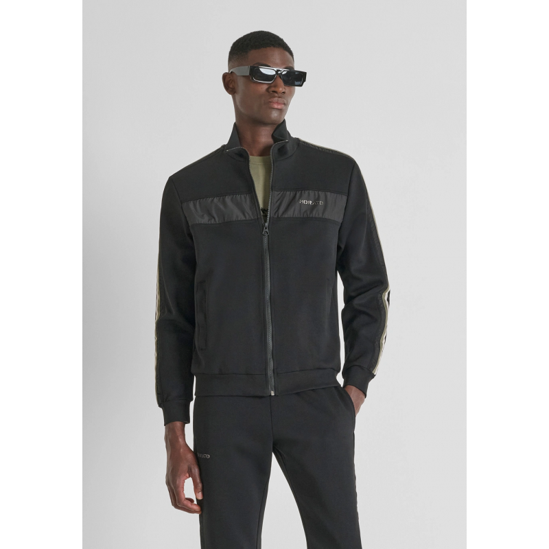 Chaqueta de corte regular para hombre. Con cremallera frontal, confeccionada en mezcla de algodón. Presenta dos bandas de color en contraste a lo largo de las mangas, una banda de tejido brillante en la parte delantera y un logotipo metálico estampado. Puños y bajo de punto elástico. Una prenda inspirada en el estilo urbano, sin renunciar a la versatilidad.