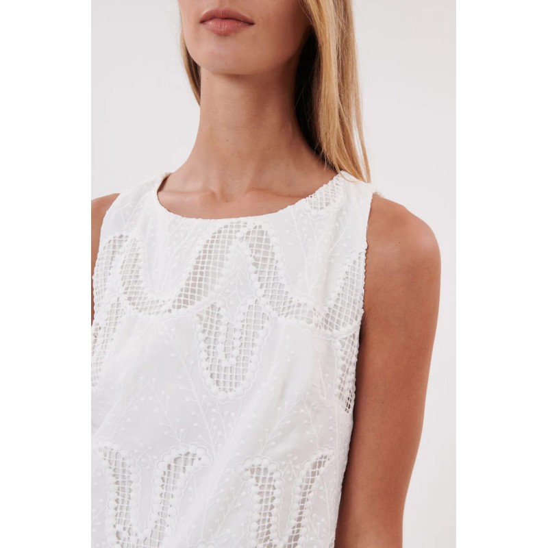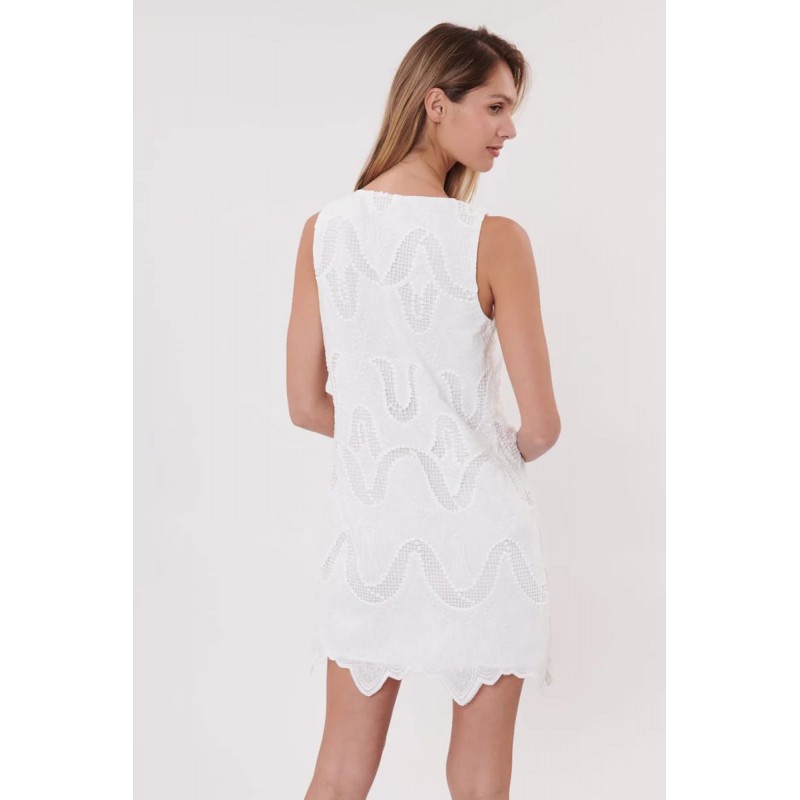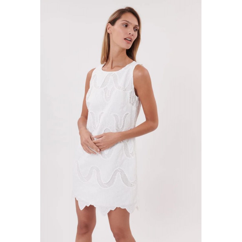 Vestido corte recto din mangas para mujer de encaje, cuello redondo y bajo rematados con festones totalmente forrado en voile de algodón.