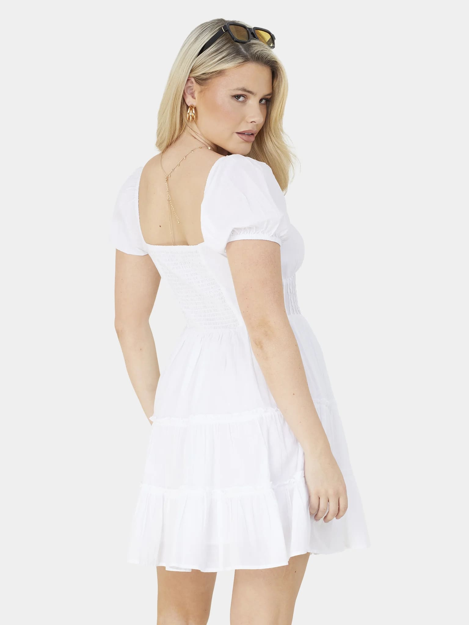 Vestido midi de escote cuadrado y manga corta. Bajo de volantes. Espalda con nido abeja.