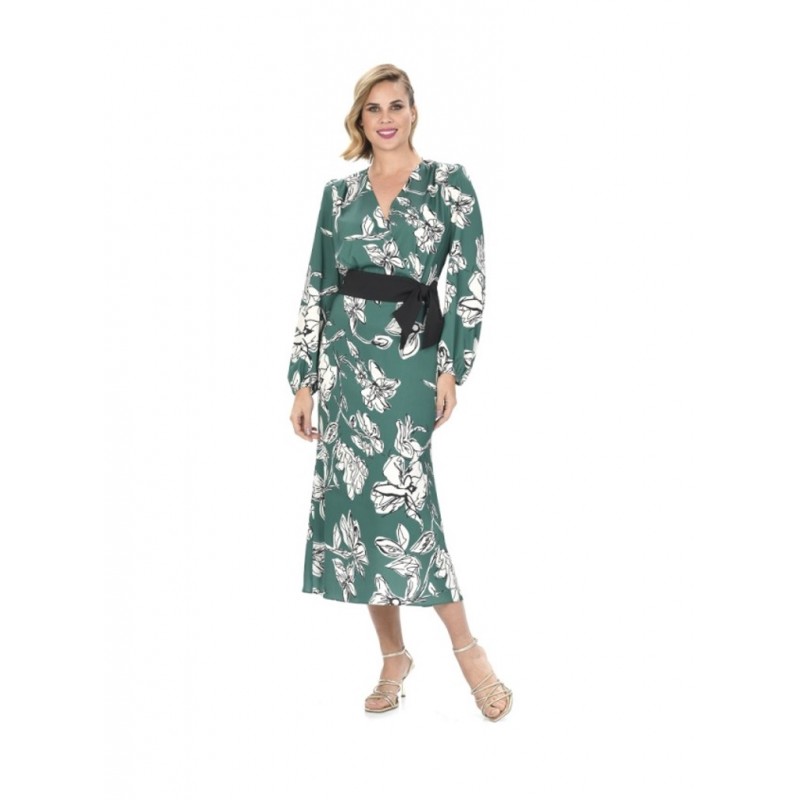 Vestido estampado largo para mujer de escote cruzado, lazo decorativo para un mejor ajuste a contrate y mangas abullonadas largas con puños fruncidos.