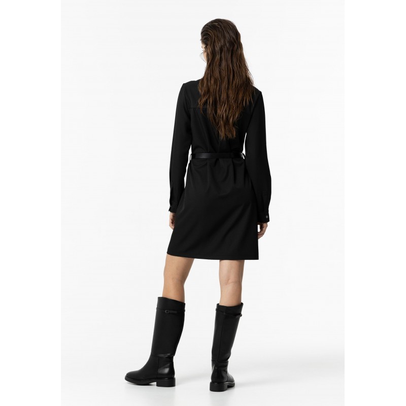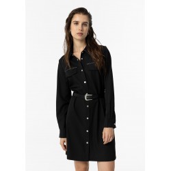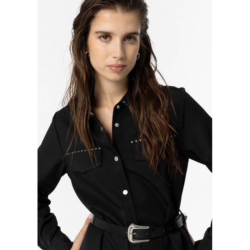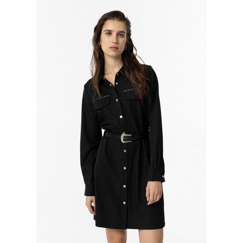 Vestido camisero con cinturón para mujer. Con cuello de solapa y manga larga con automático en los puños. Aplicación de cinturón efecto piel. Bolsillos falsos delanteros. Cierre frontal con automáticos. Detalle apliques metálicos.