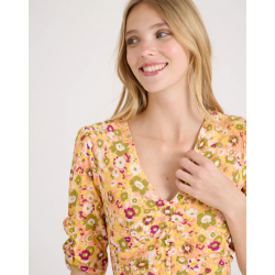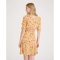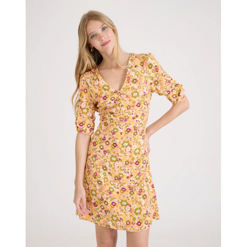Vestido corto para mujer. Con detalle de fruncidos en el escote y mangas. Cierre con cremallera trasera.