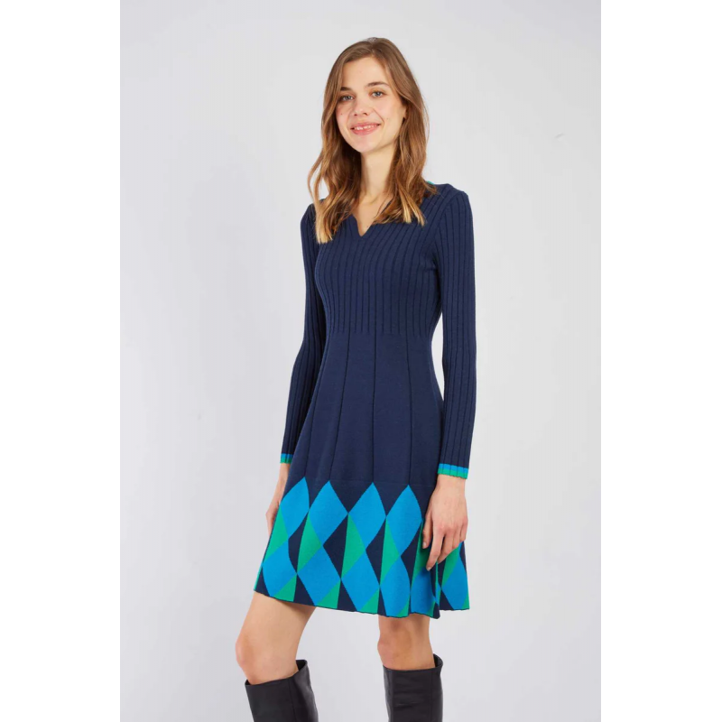 Vestido corto de punto para mujer. Top estructurado con elegante ribete. El estampado geométrico de jacquard en el bajo le da un toque moderno y gráfico. Una prenda cómoda y moderna, ideal para el invierno.