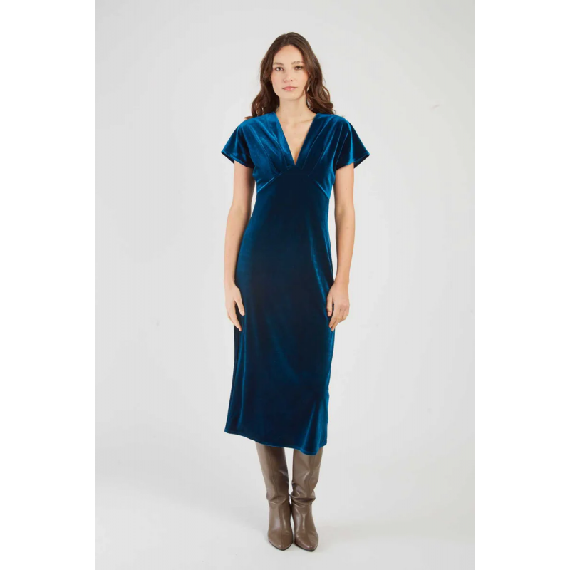 Vestido largo para mujer. De terciopelo suave y elegante, con aberturas y frunces en el pecho que realzan la silueta. Las mangas cortas le dan un toque ligero al corte. Sin forro, ideal para una noche o un evento en climas más frescos.