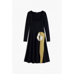 Vestido midi, de manga larga, escote redondo pronunciado y falda evasé en color liso con estampado de lirio.