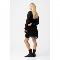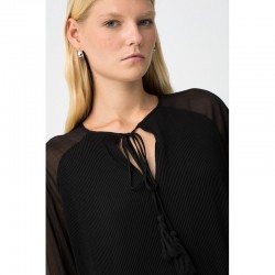 Vestido corto para mujer. De corte regular liso con plisado. Cuello redondo con cordón y detalle de flecos. Manga larga con puños elásticos. Interior forrado.