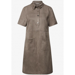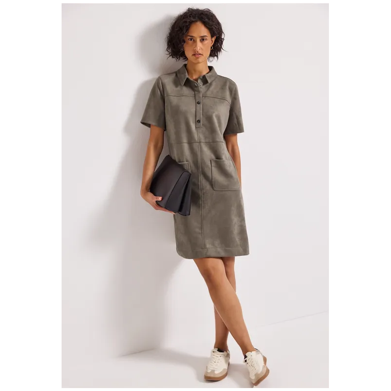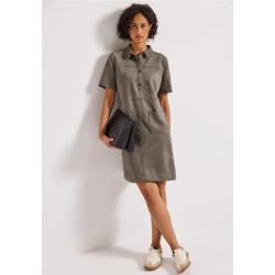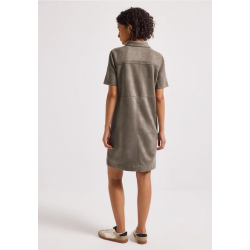 Vestido terciopelo para mujer. Su cuello camisero, mangas cortas y una tapeta con botones decorativos crean un look femenino a la vez que informal. Sus bolsillos de parche y su corte hasta la rodilla lo convierten en un complemento versátil para el día a día.