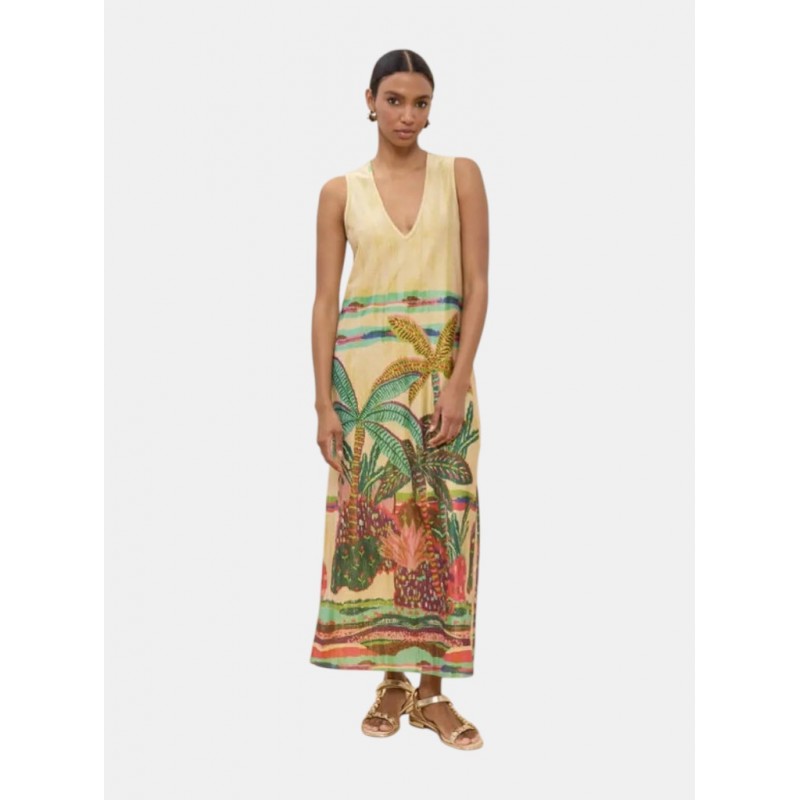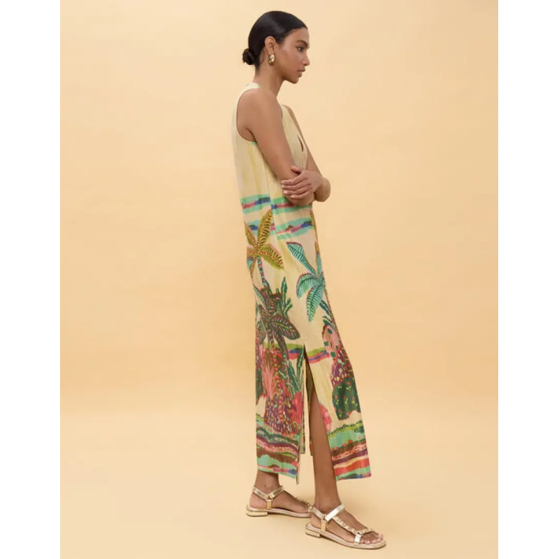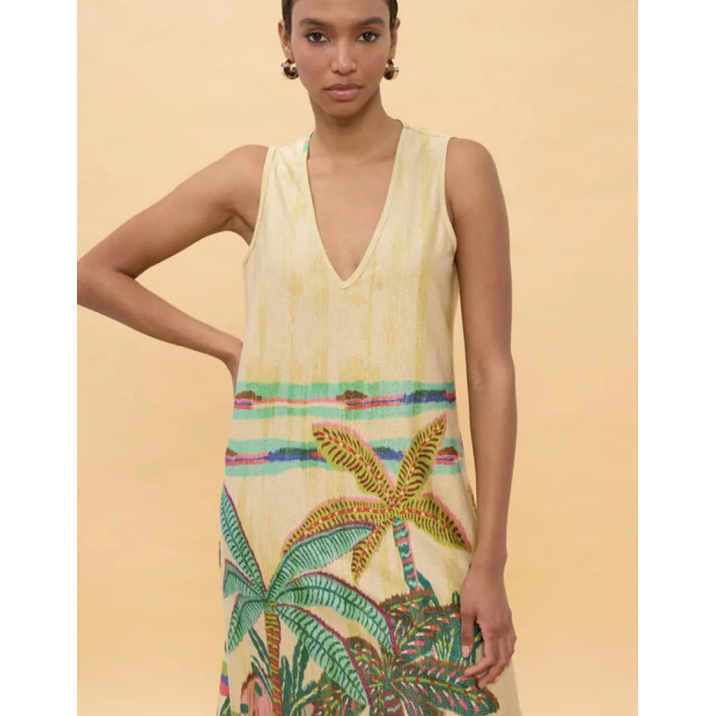 Vestido sin mangas con estampado tropical de diseño fluido que ofrece un ajuste cómodo y ligero. Escote en V profundo, ideal para las noches de verano. Confeccionado en poliéster de alta calidad para una caída perfecta.