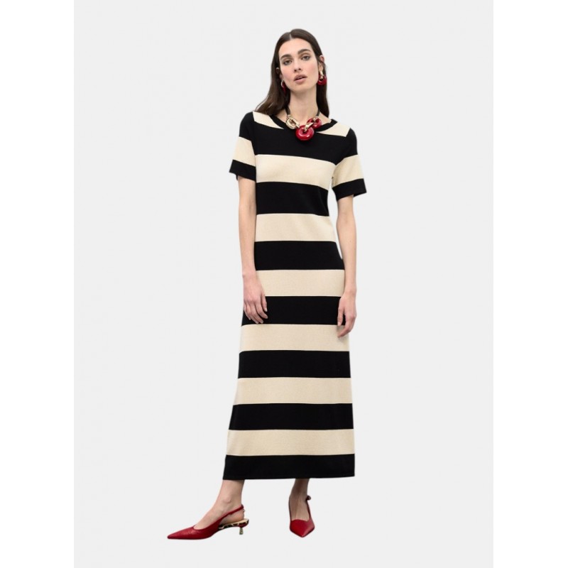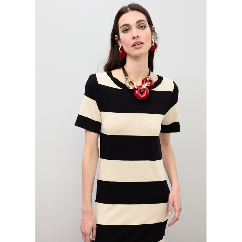 Vestido de tricot con diseño bicolor a rayas, ideal para cualquier ocasión. Manga corta y corte recto, confeccionado para ofrecer comodidad y estilo. Perfecto para combinar con accesorios llamativos.