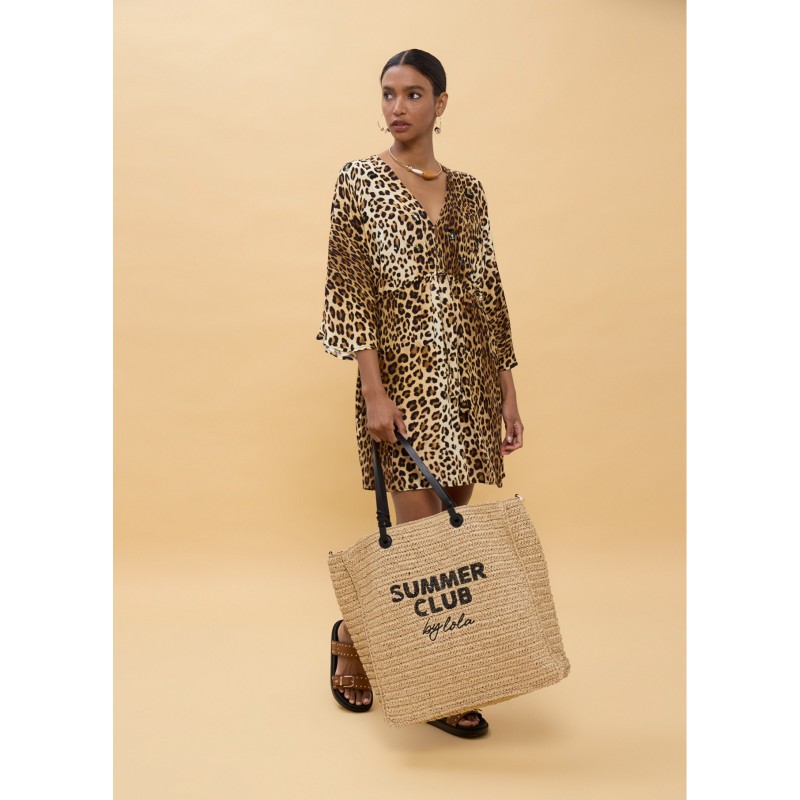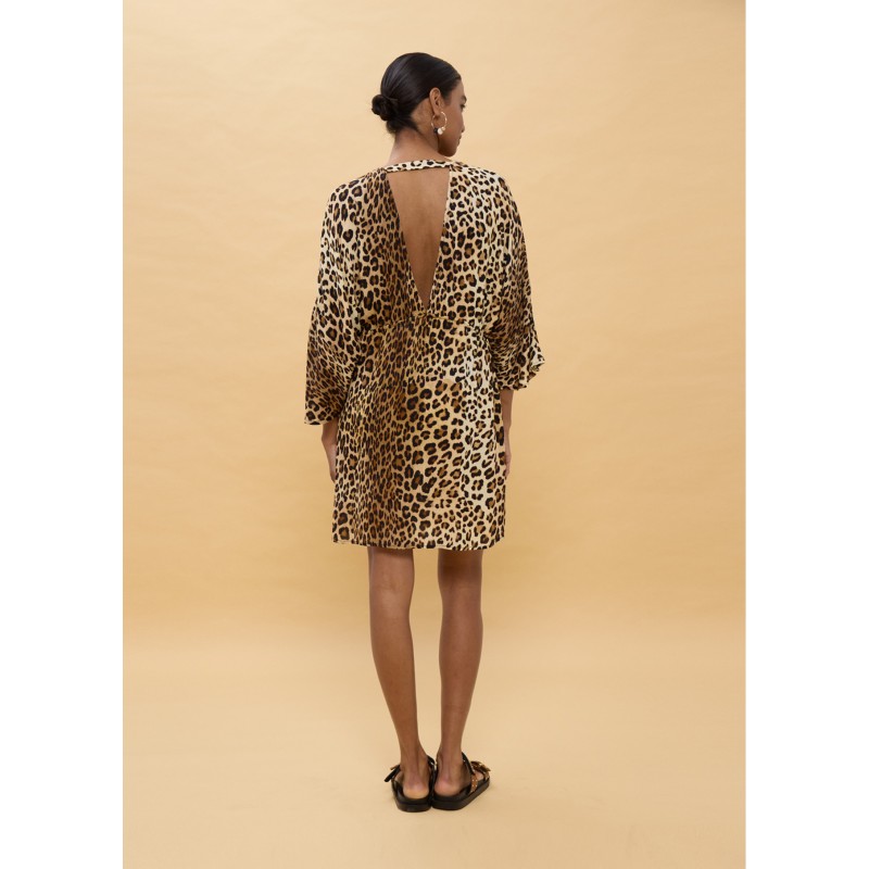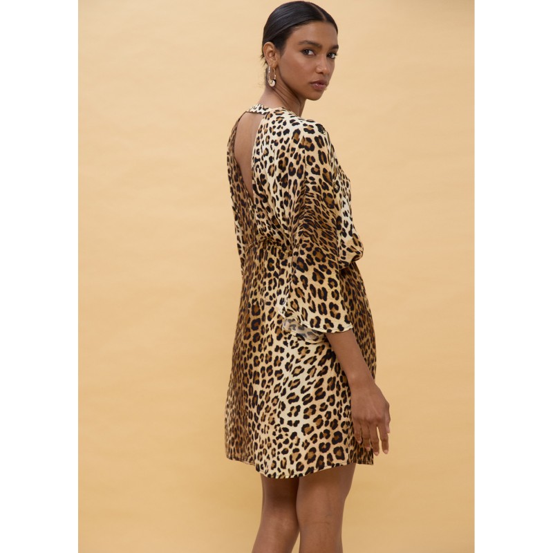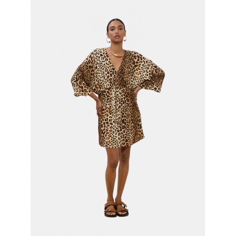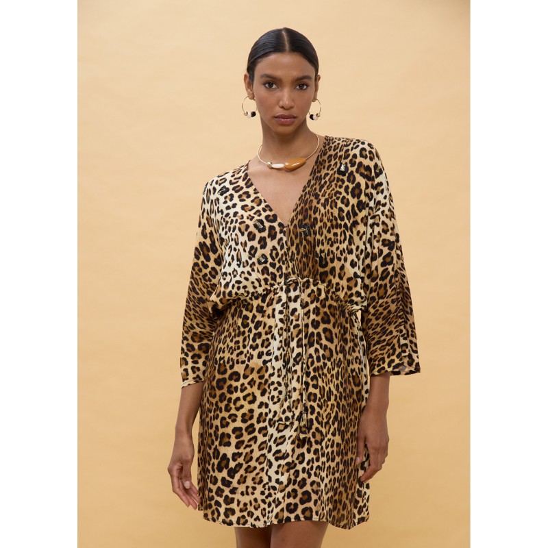 Vestido corto con estampado animal llamativo, mangas anchas y cinturón ajustable. Confeccionado en viscosa ligera para un ajuste cómodo y fluido. Perfecto para destacar en cualquier ocasión veraniega.