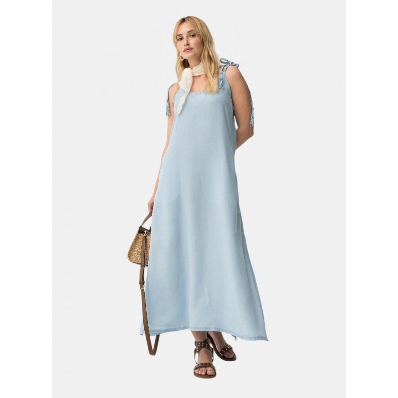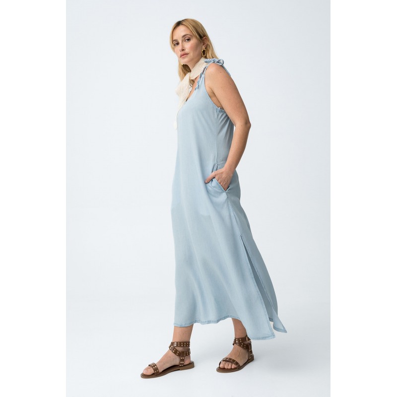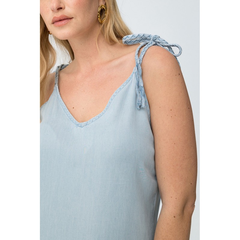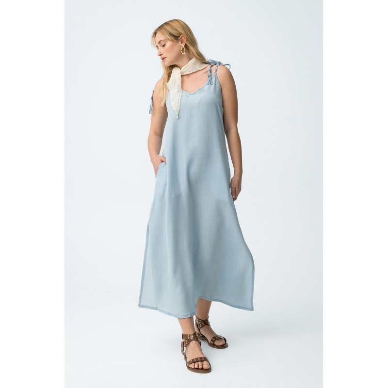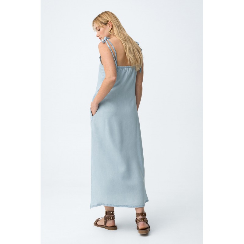 Vestido azul claro de corte slim, tirantes finos ajustables con lazos y escote en pico