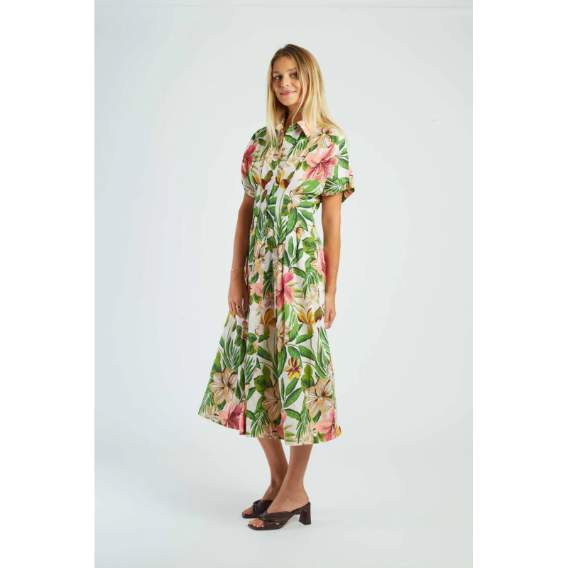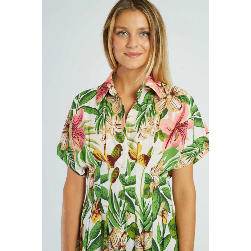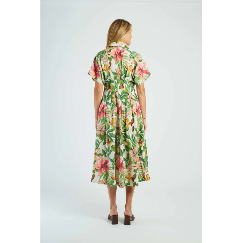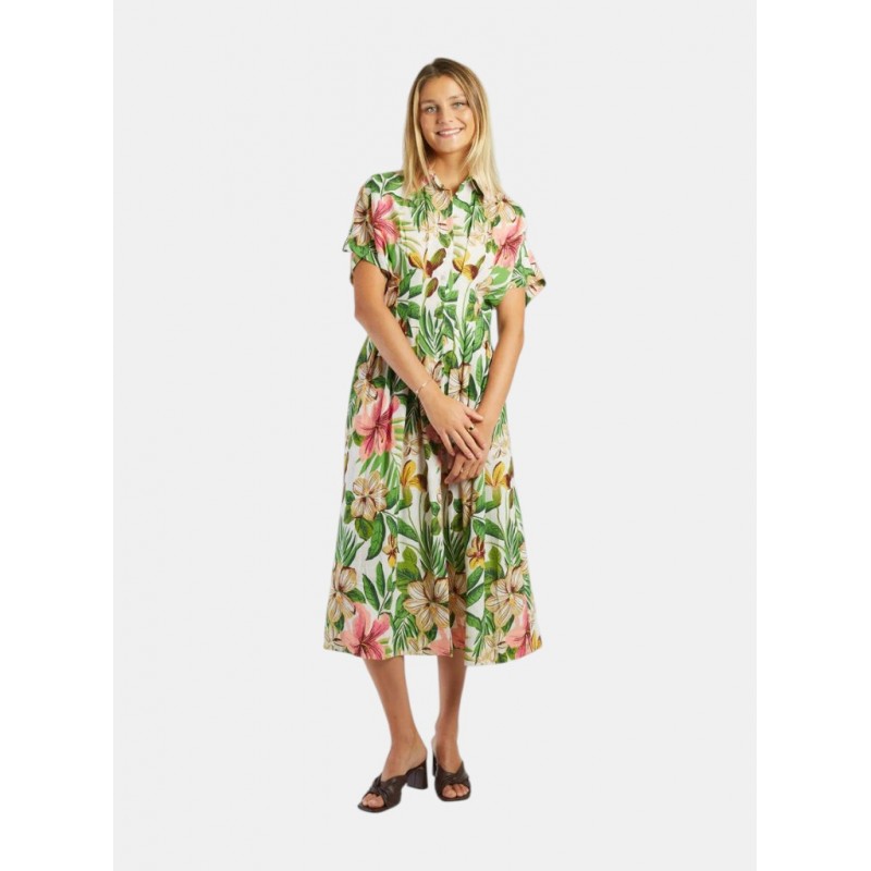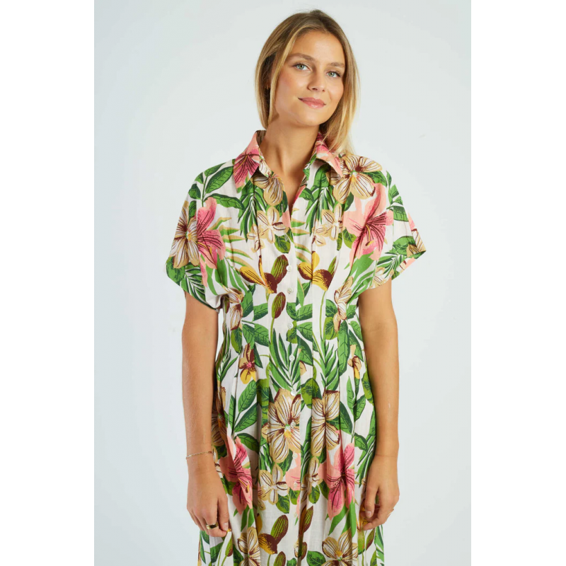Vestido midi de manga corta, adornado con un delicado estampado floral. Cierre de botones en la parte delantera y cintura definida para realzar la figura. La falda plisada le aporta ligereza y movimiento. Una prenda elegante y femenina, perfecta para los días soleados.
