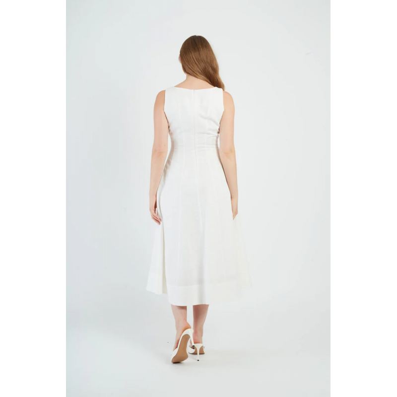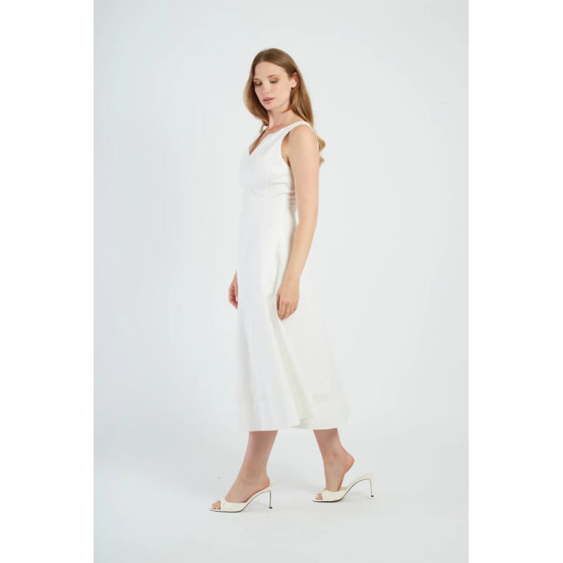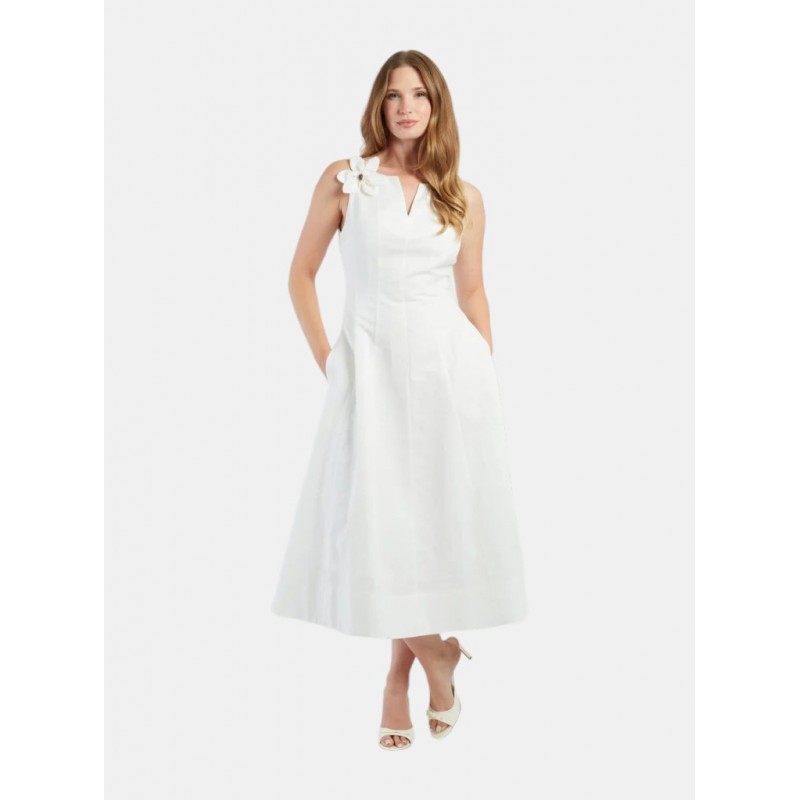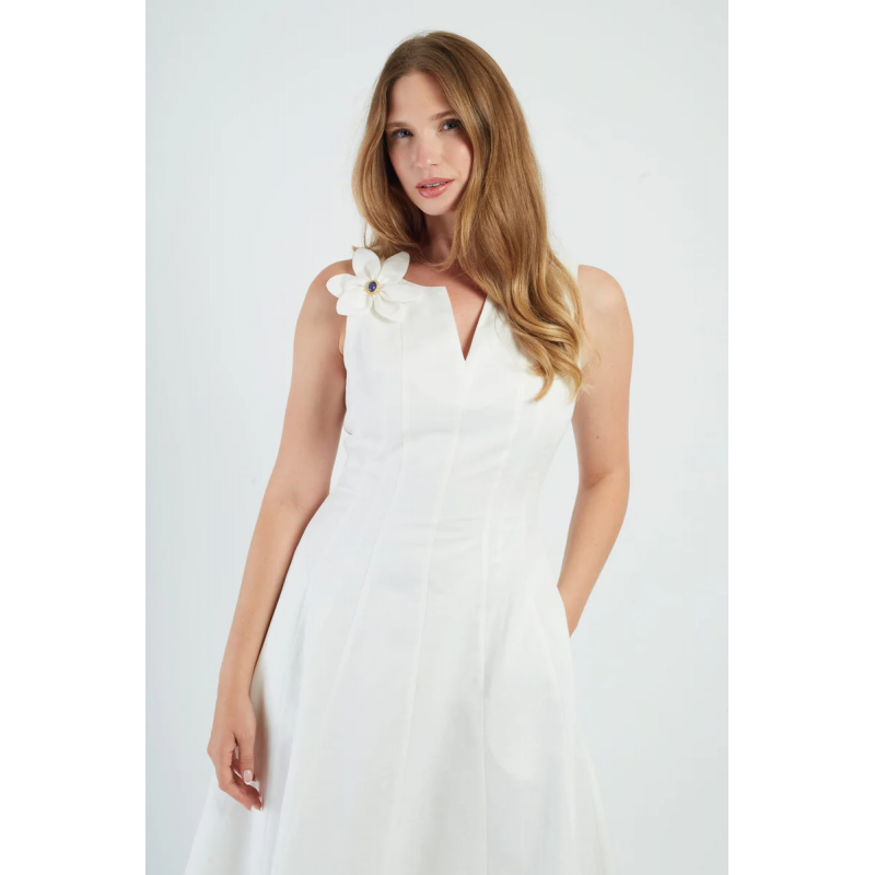 Vestido de tirantes de largo medio, confeccionado en lino. Presenta una cintura definida y una falda acampanada que le aporta fluidez y elegancia. Con bolsillos laterales invisibles, está adornado con un broche floral extraíble que le da un toque femenino y refinado.