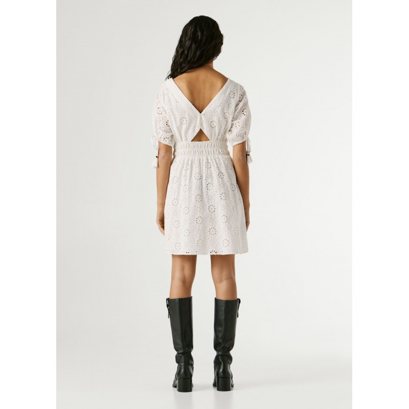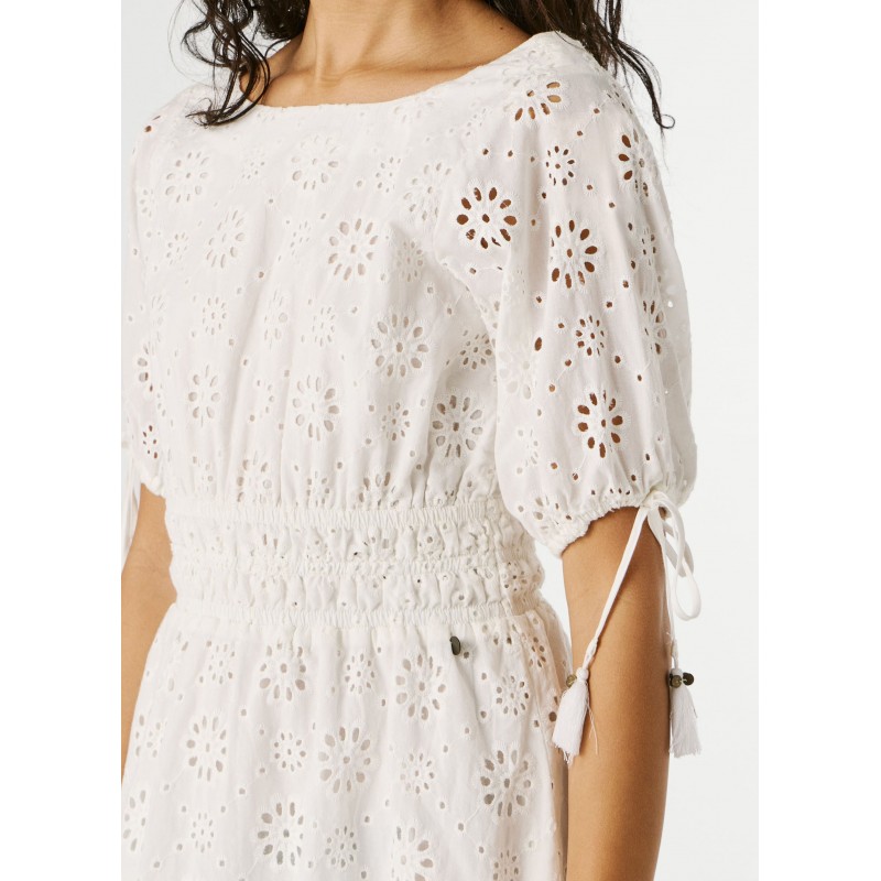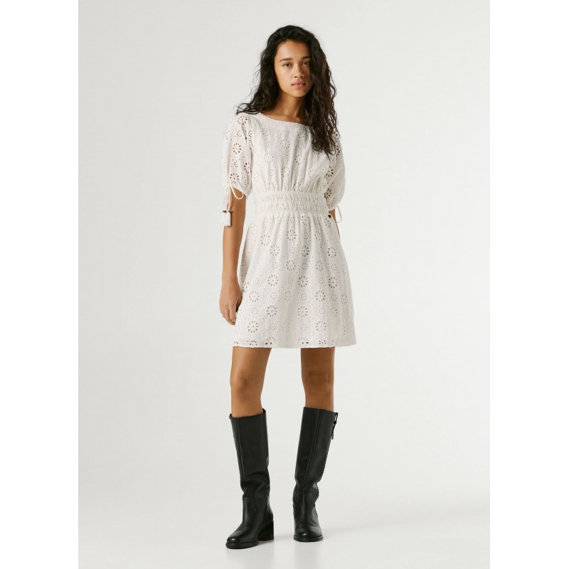 Vestido para mujer de detalles calados, cuello redondo, escote en pico en la espalda con cierre abotonado, cintura elástica con panel fruncidos y manga corta abullonada con detallle de borlas decorativas y tachuelas metalicas a los extremos y corta.