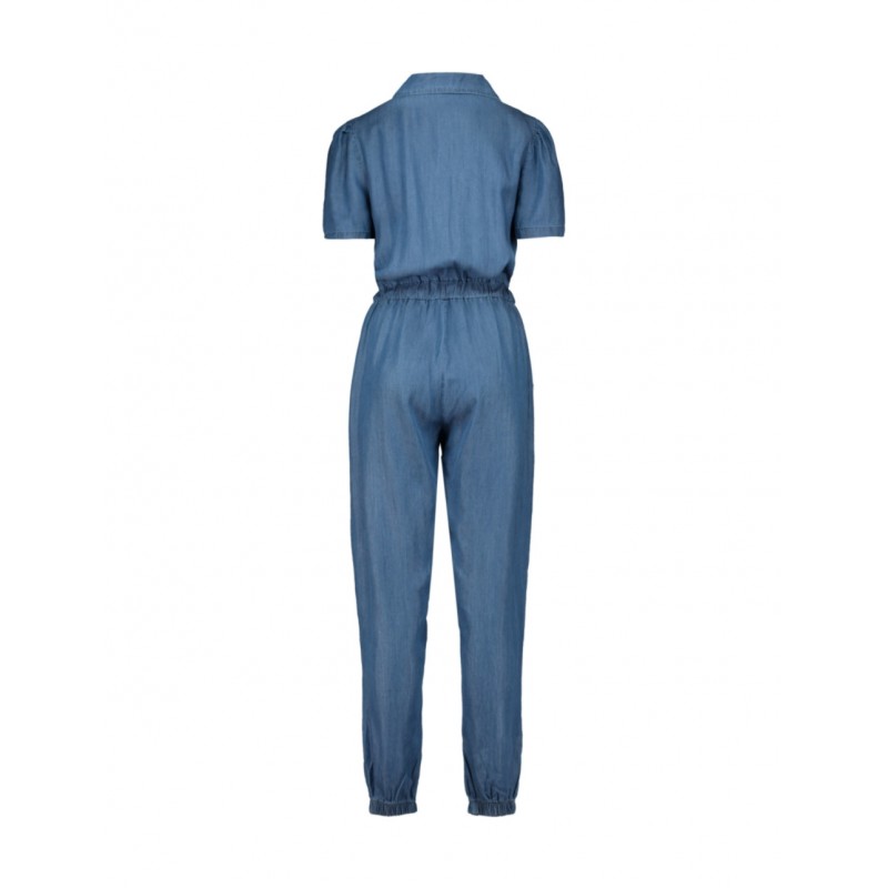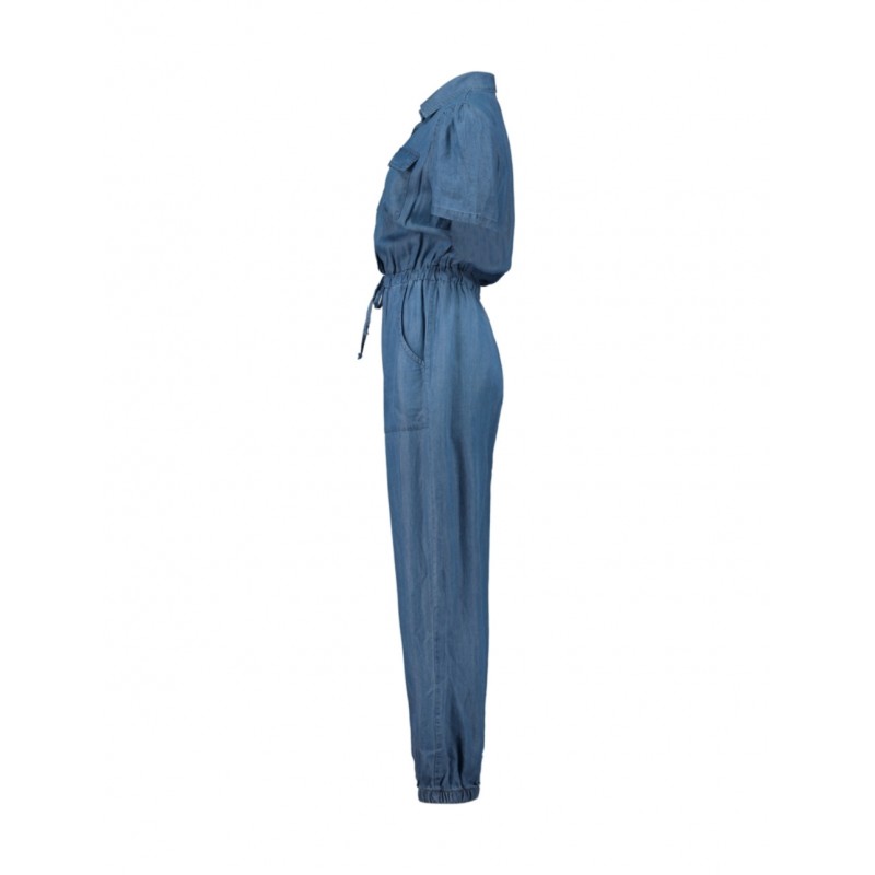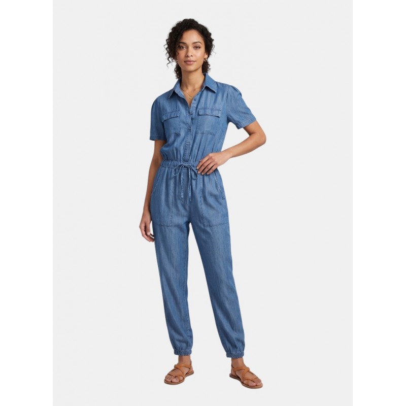 Mono liso para mujer de cuello de solapa, abotonado de manga corta con bolsillos de solapa en el pecho, cintura elástica ajustable con cordón, bolsillos laterales en la parte baja y bajo fruncido al tobillo.