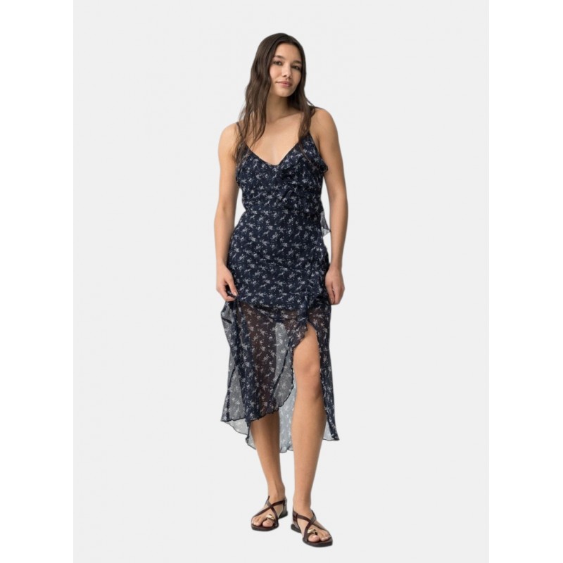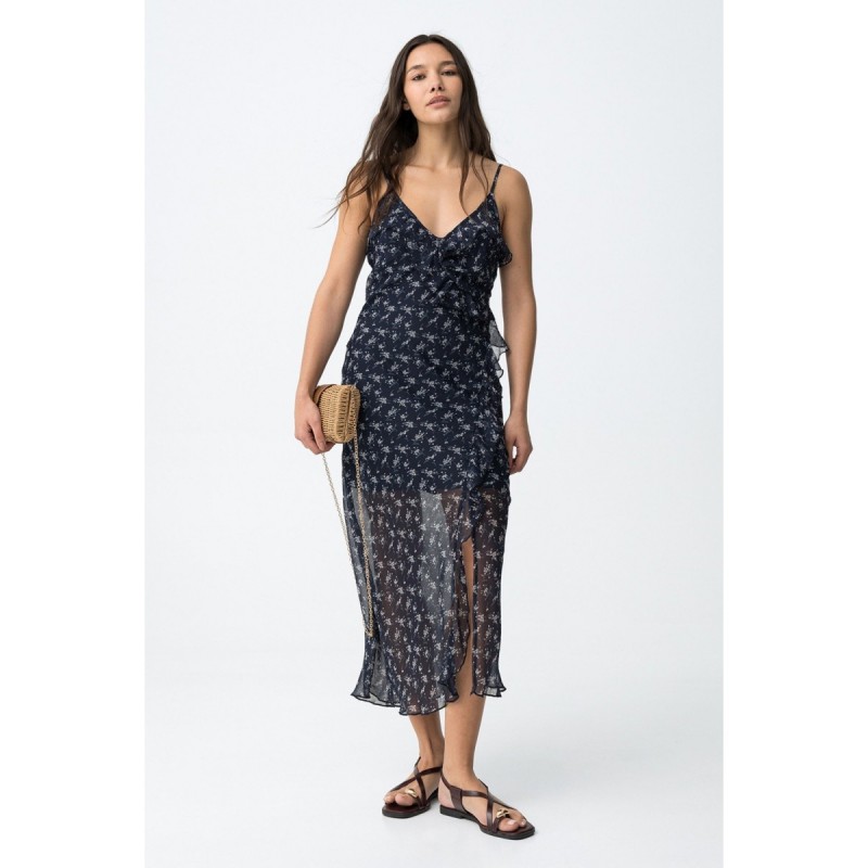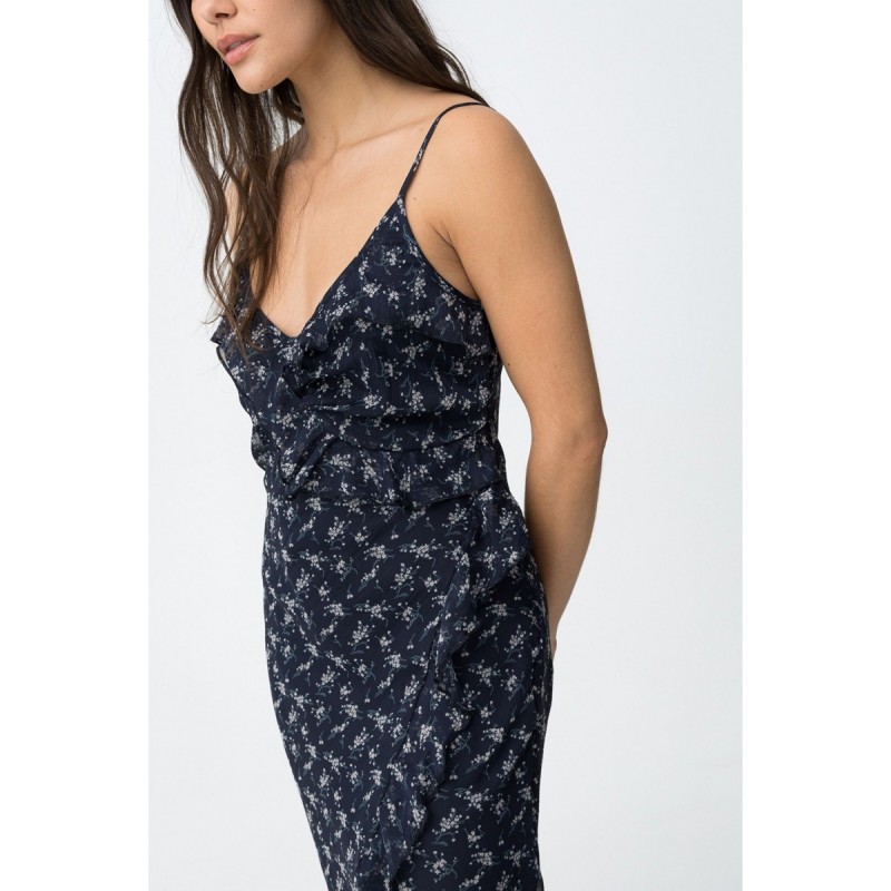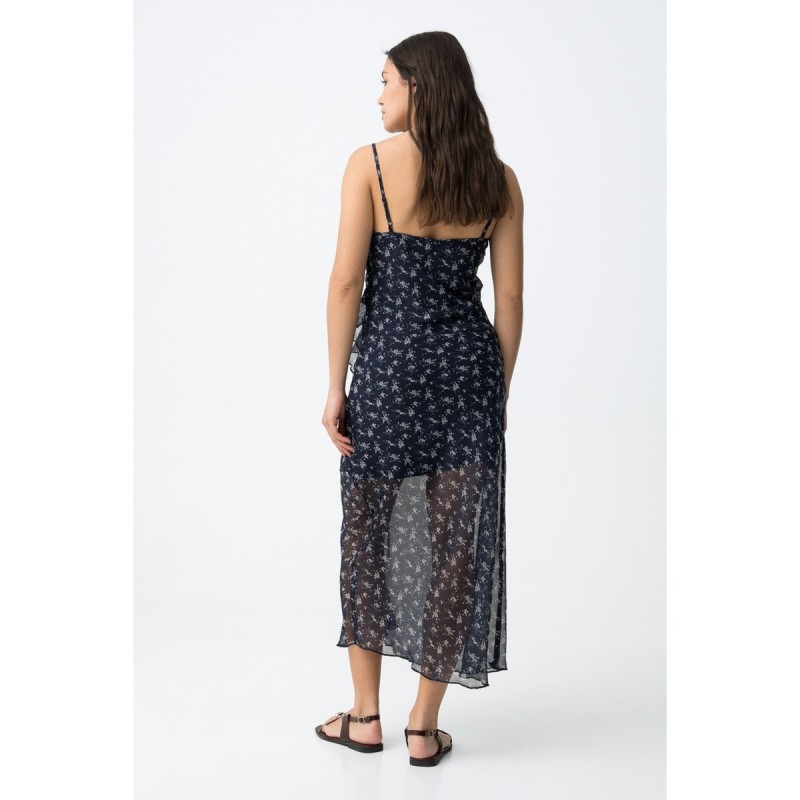 Vestido largo para mujer de flores con escote en pico, detalle de volantes y tirantes finos.